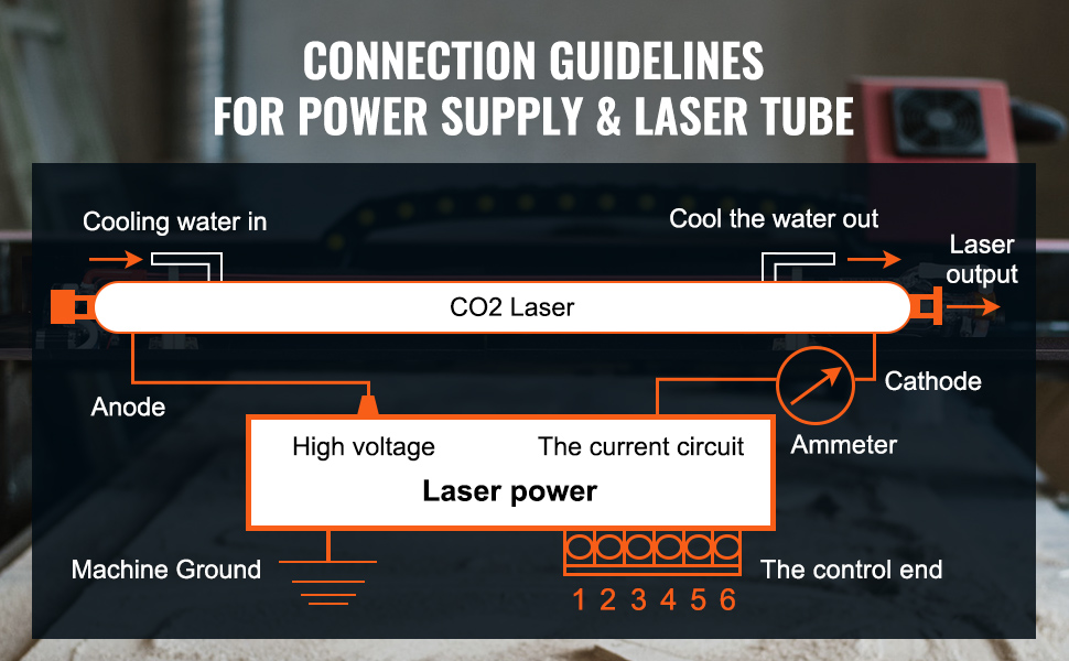 Laserová trubica musí byť pri práci chladená vodou a zároveň nezapínajte vysokonapäťový výstup a zabezpečte, aby kladné a záporné svorky vysokonapäťového výstupu boli správne prepojené s kladnými a zápornými svorkami lasera.