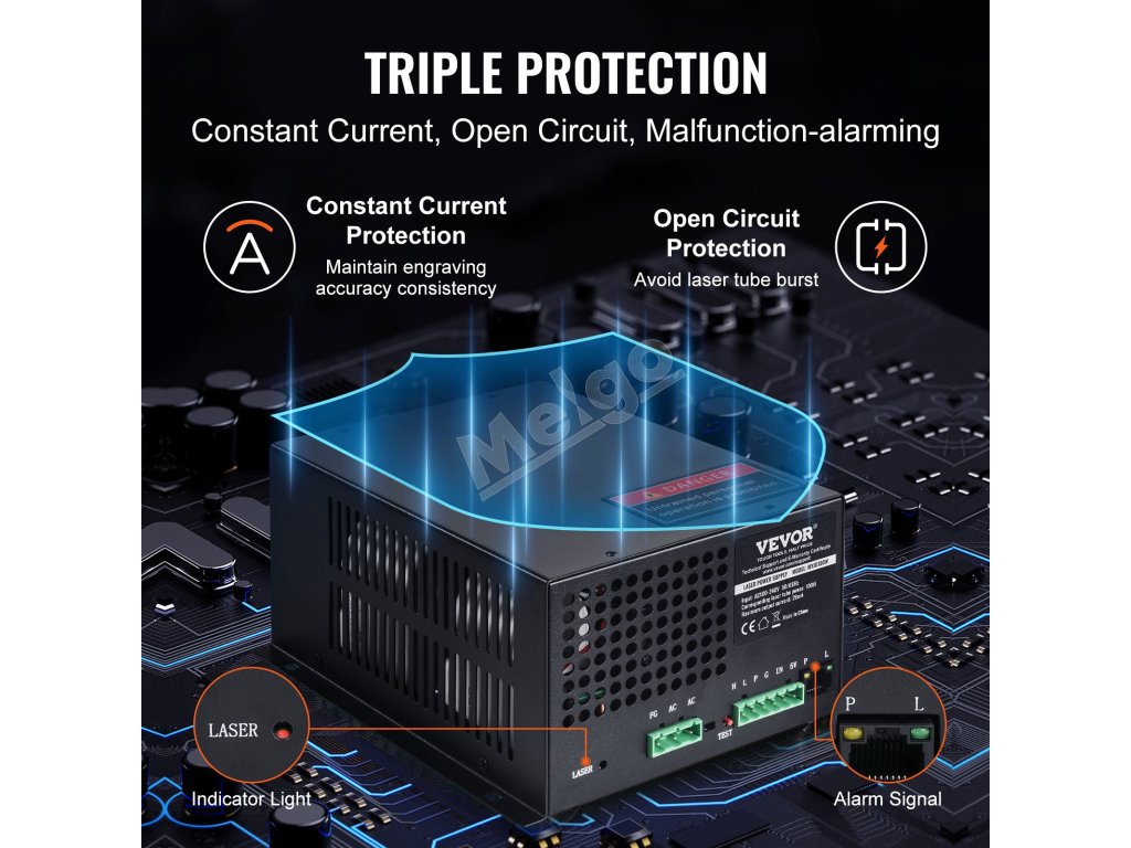 Náš laserový napájací zdroj je kompatibilný s väčšinou laserových trubíc na trhu, má trvanlivú kvalitu a trojitú ochranu (ochrana proti konštantnému prúdu, ochrana proti otvorenému obvodu, ochrana proti korózii), aby spĺňal potreby viacerých remeselných odvetví.