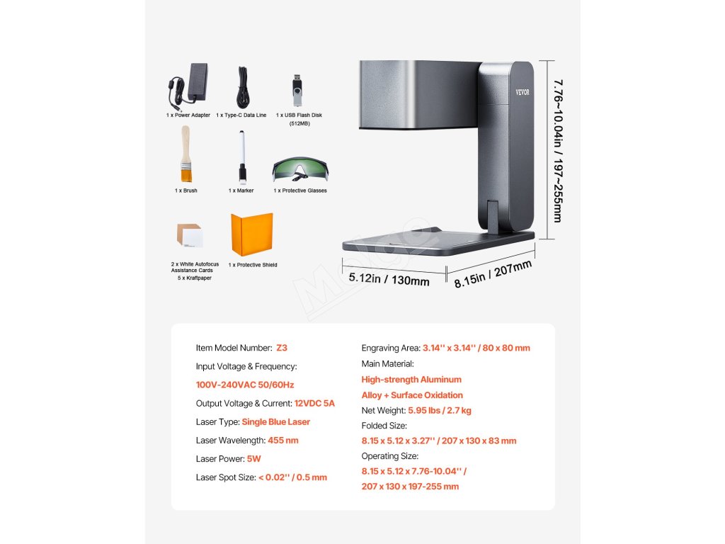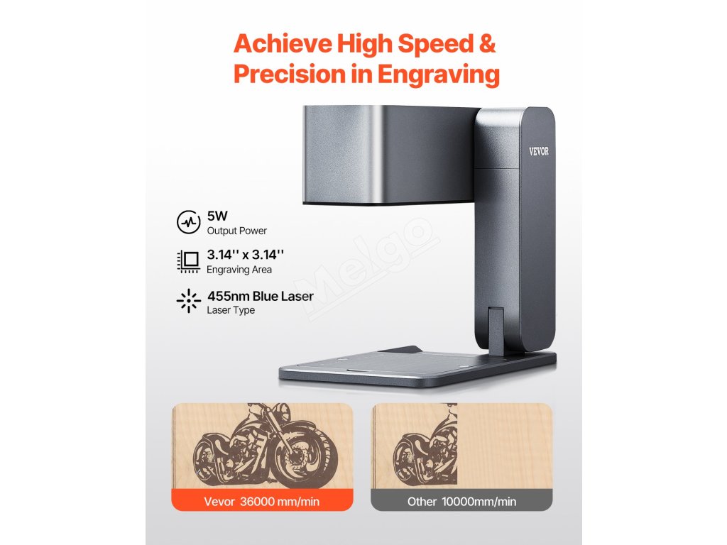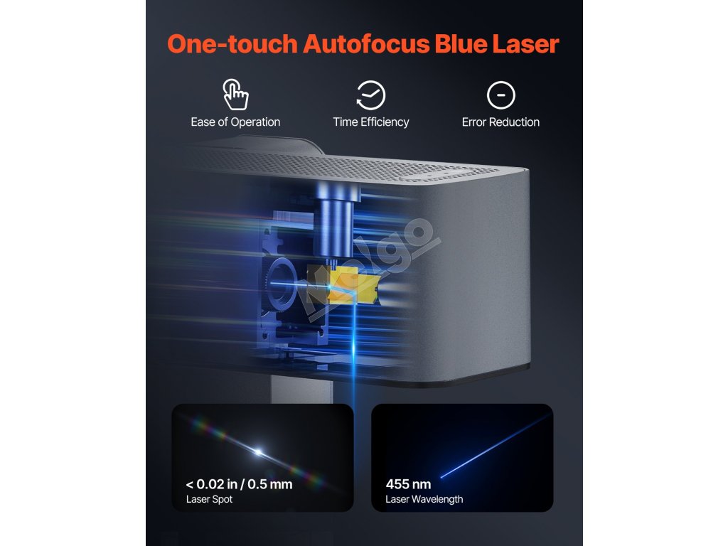 Tento 5W modrý laserový gravírovací stroj dosahuje rýchlosť 600 mm/s a gravírovaciu plochu 3,14'' x 3,14''. Vďaka automatickému zaostrovaniu jedným dotykom a laserovému bodu s veľkosťou 0,02 palca je skvelý na gravírovanie nekovových materiálov. Je kompatibilný so systémami Android, iOS, Windows a pod. a podporuje viacero formátov súborov - ideálny pre každé pracovisko.