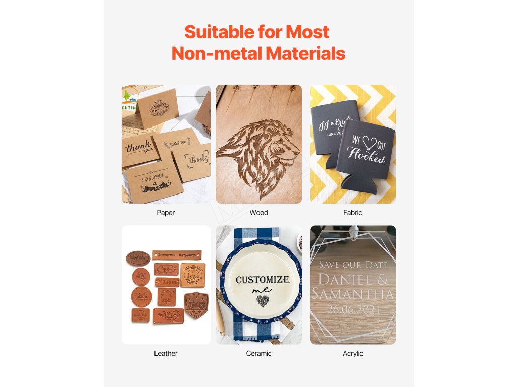 Tento prenosný gravírovací stroj je vhodný na väčšinu nekovových materiálov, ako je papier, drevo, látka, koža, kameň, keramika a akryl. Spĺňa rôzne potreby spracovania so širokou kompatibilitou a vysokoúčinným gravírovacím výkonom.
