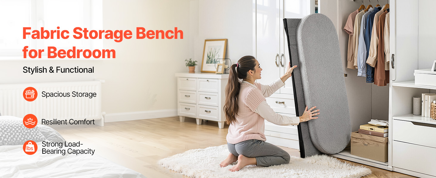 Naša úložná lavica otoman, navrhnutá s výklopným vekom, poskytuje priestranný vnútorný priestor na uloženie posteľnej bielizne, kníh alebo každodenných potrieb a udržiava vašu spálňu upratanú a organizovanú. Veko sa dá pohodlne otvoriť a vyberať a vkladať predmety, čo vám umožní mať uprataný a organizovaný obytný priestor.