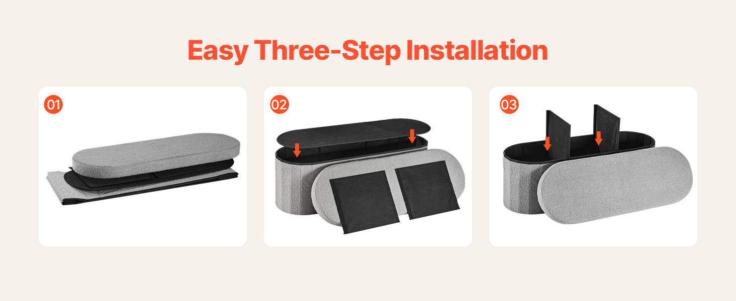 Nie sú potrebné žiadne špeciálne nástroje - inštalácia trvá len tri kroky. Náš úložný otoman nemá zložitý proces inštalácie a bez problémov sa začlení do vášho domáceho života. Komfort a pohodlie si môžete užívať rýchlo.