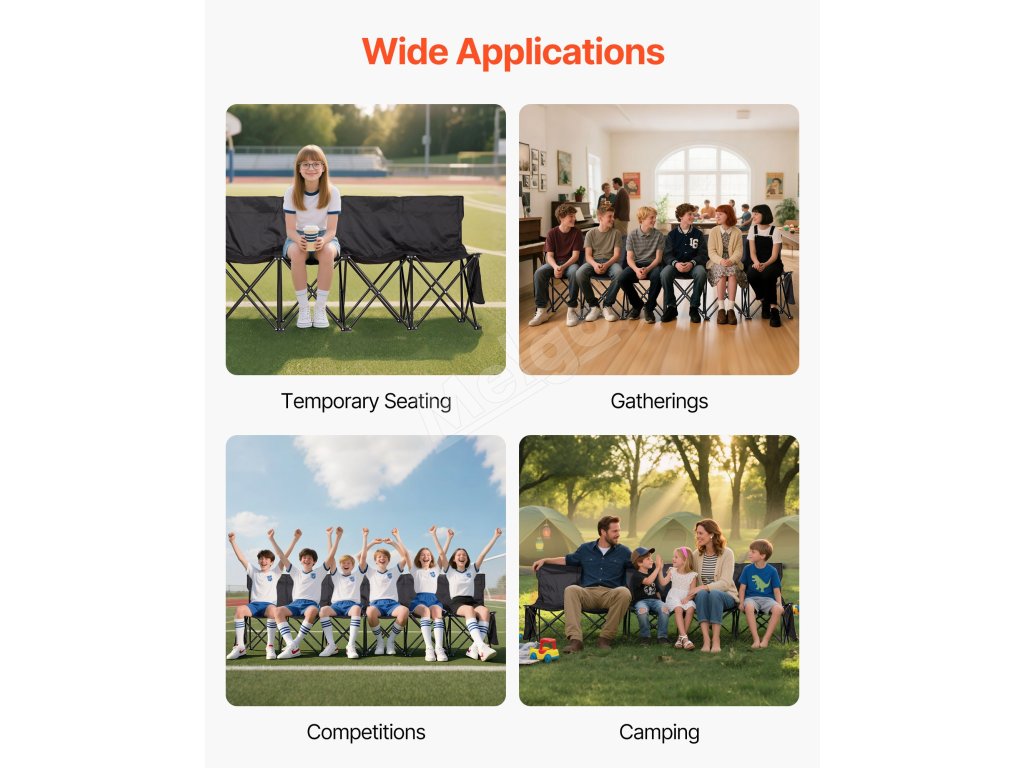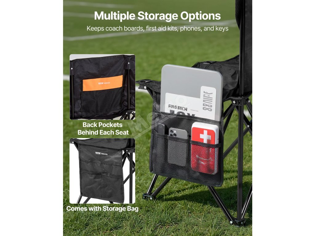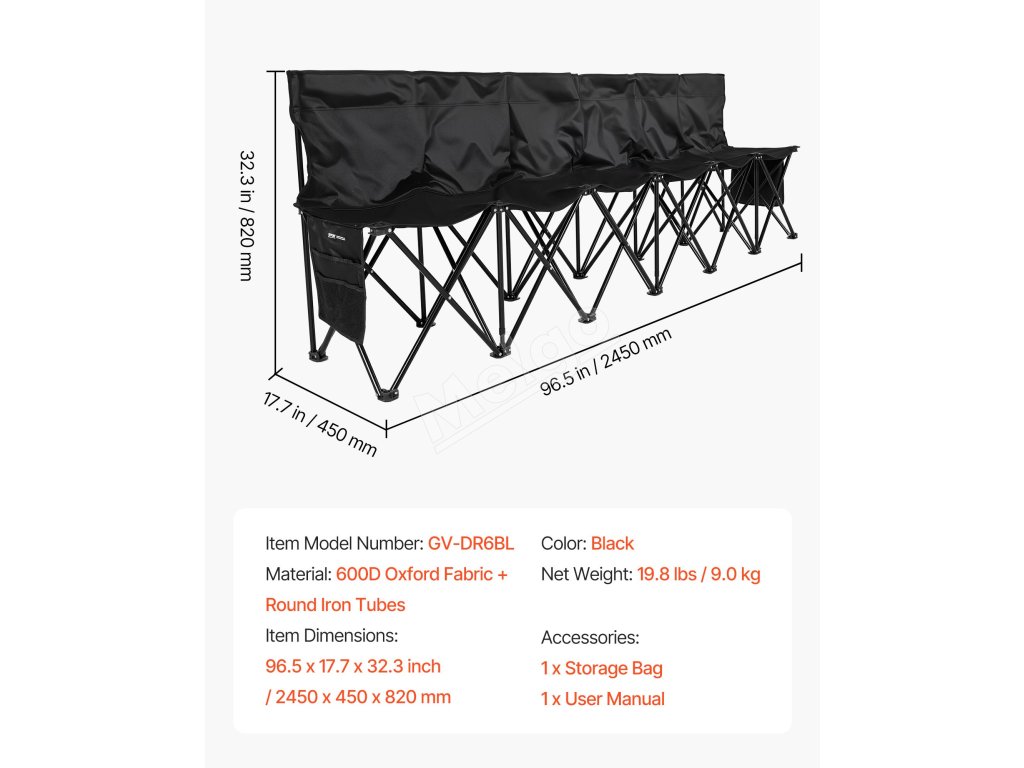Tento výrobok je vyrobený z odolnej tkaniny 600D oxford so zosilnenými, vystuženými podpornými tyčami na zvýšenie pevnosti a stability. Vďaka skladaciemu dizajnu je ideálna na športové podujatia, večierky, kempovanie v prírode alebo na akúkoľvek príležitosť, pri ktorej potrebujete sedenie pri postrannej čiare.