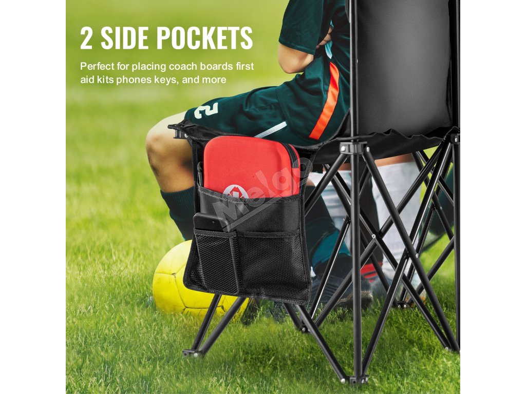 Táto skladacia lavica na sedenie je vybavená premyslenými úložnými vreckami na zvýšenie funkčnosti, pričom na oboch koncoch sú bočné vrecká - ideálne na uloženie trénerskej dosky, lekárničky, telefónu, kľúčov a ďalších vecí.