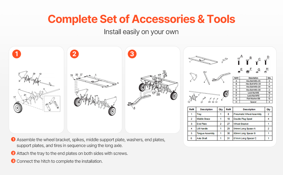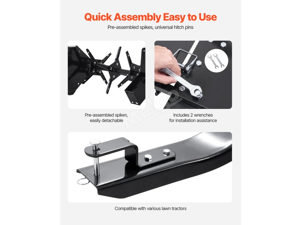 Náš ťahaný prevzdušňovač trávnika sa dodáva s kompletnou sadou inštalačného náradia a návodom na použitie, čo umožňuje jednoduchú montáž podľa návodu krok za krokom.