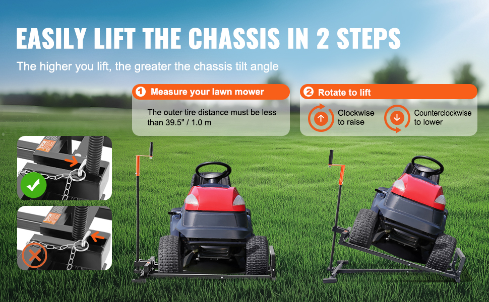 Po zaparkovaní vozidla na zdvihák kosačky na trávu ho jednoducho otáčaním rukoväte bez námahy zdvihnete. Ak šírka zadných kolies kosačky presahuje limit, zdvihák môžete používať aj tak, že zdvihnete predné kolesá.