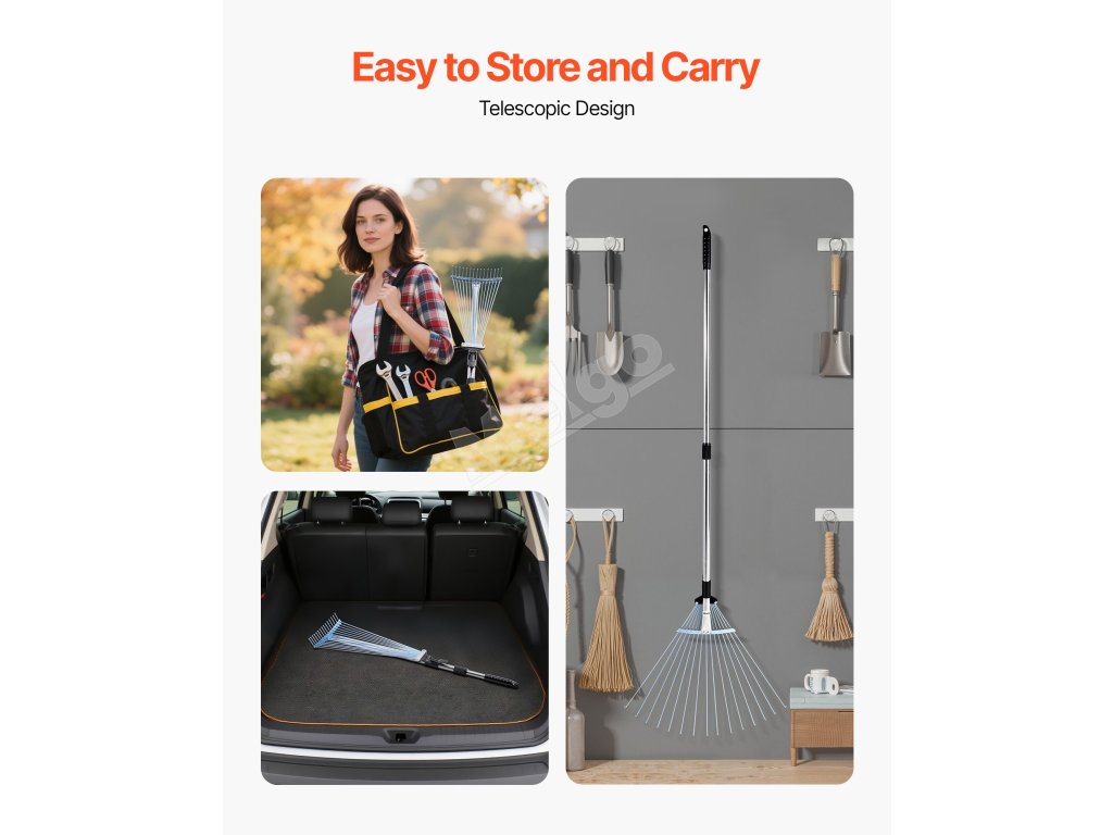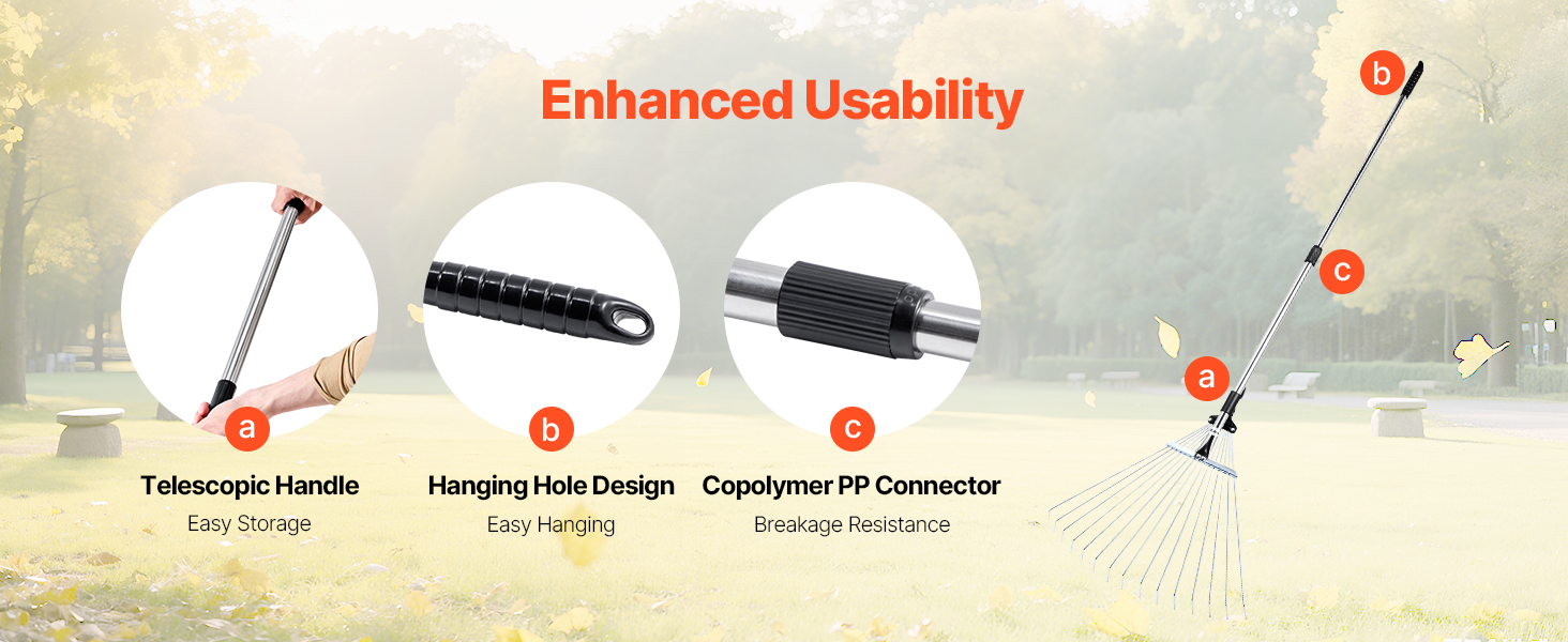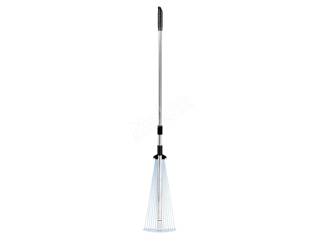 Teleskopická násada sa skladá na kompaktné uskladnenie. Naše kovové hrable na lístie sú vybavené otvorom na zavesenie na uskladnenie, protišmykovou rukoväťou pre pohodlie a odolným kopolymérovým PP konektorom, ktorý zabraňuje praskaniu počas vonkajších prác.