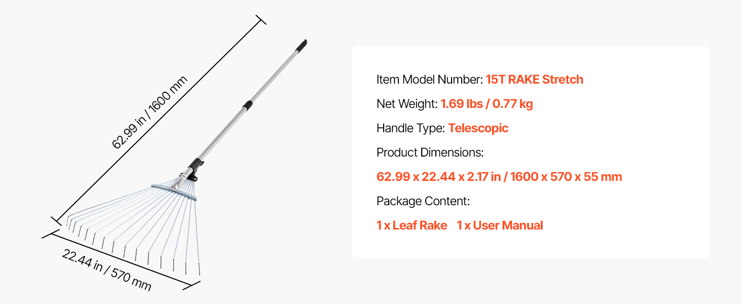 Hrabľa na lístie, 15 kovových zubov, šírka 19-57 cm, dĺžka 81.3-160 cm