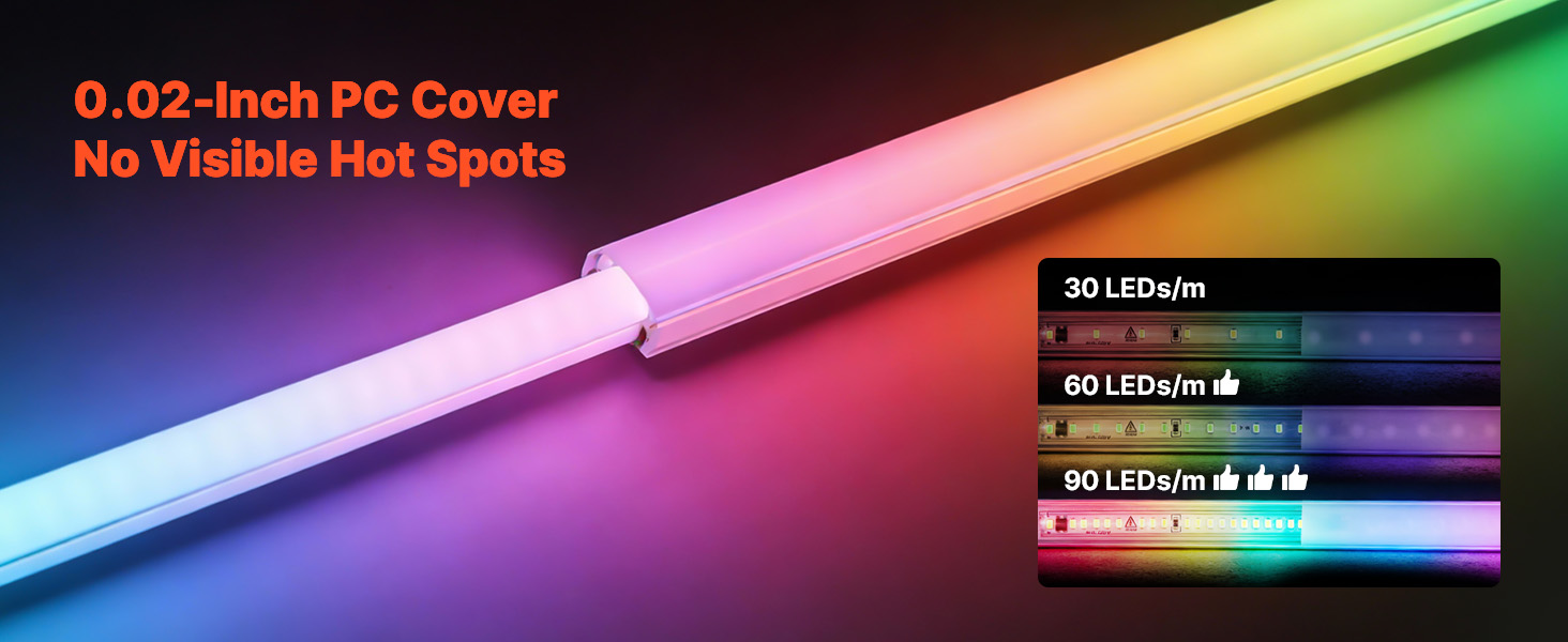 Kanál difúzora LED pásika používa 0,02 palca hrubý PC kryt, ktorý rovnomerne rozptyľuje svetlo, redukuje ostré body a je šetrný k očiam. Vytvára hladkú, mäkkú a príjemnú atmosféru osvetlenia.