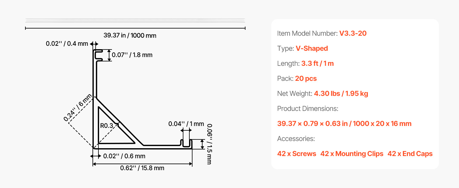 LED kanál v tvare V, 3,3 ft, balenie po 20 kusoch