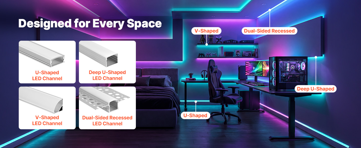 Tento systém LED svetelných kanálov obsahuje profily v tvare U, hlboké profily v tvare U, profily v tvare V a obojstranné zapustené profily, ktoré spĺňajú rôzne požiadavky na osvetlenie a inštaláciu v jednom kompletnom riešení.