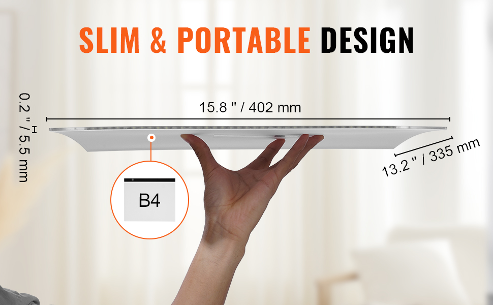 Vďaka kompaktnej veľkosti B4, tenkej hrúbke 0,2" a hmotnosti len 1,26 kg sa naša diamantová umelecká svetelná tabuľa ľahko zmestí do batohu, kufríka alebo tašky na notebook, čo vám umožní vziať si ju kamkoľvek, do interiéru alebo exteriéru.