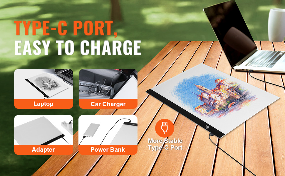 Táto kresliaca svetelná tabuľa je vybavená portom typu C, ktorý zaručuje stabilné nabíjanie a používanie. Môžete ju pripojiť k notebooku alebo prenosnej powerbanke, čím sa oslobodíte od obmedzení pevných elektrických zásuviek.