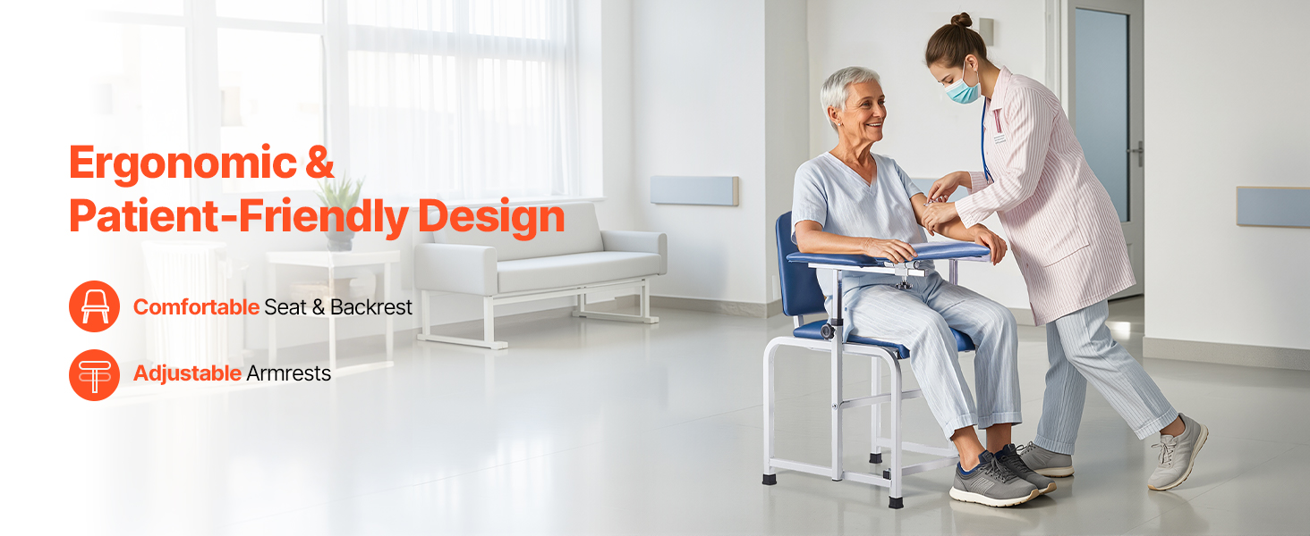 Táto flebotomická stolička spája odolnosť, pohodlie a komfort. Vďaka vysokopevnostnému rámu z uhlíkovej ocele, nastaviteľným podrúčkam, pohodlnému polstrovanému sedadlu a ľahko čistiteľnému povrchu z PVC kože zaručuje pohodlnejší odber krvi - ideálny pre kliniky, laboratóriá a nemocnice.