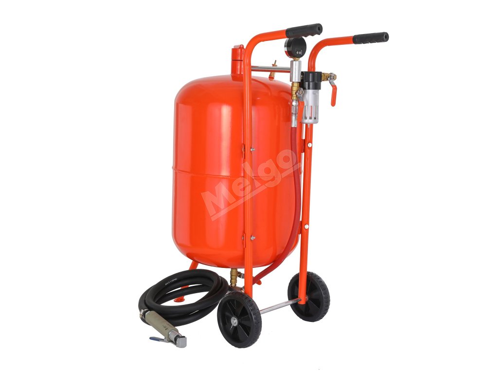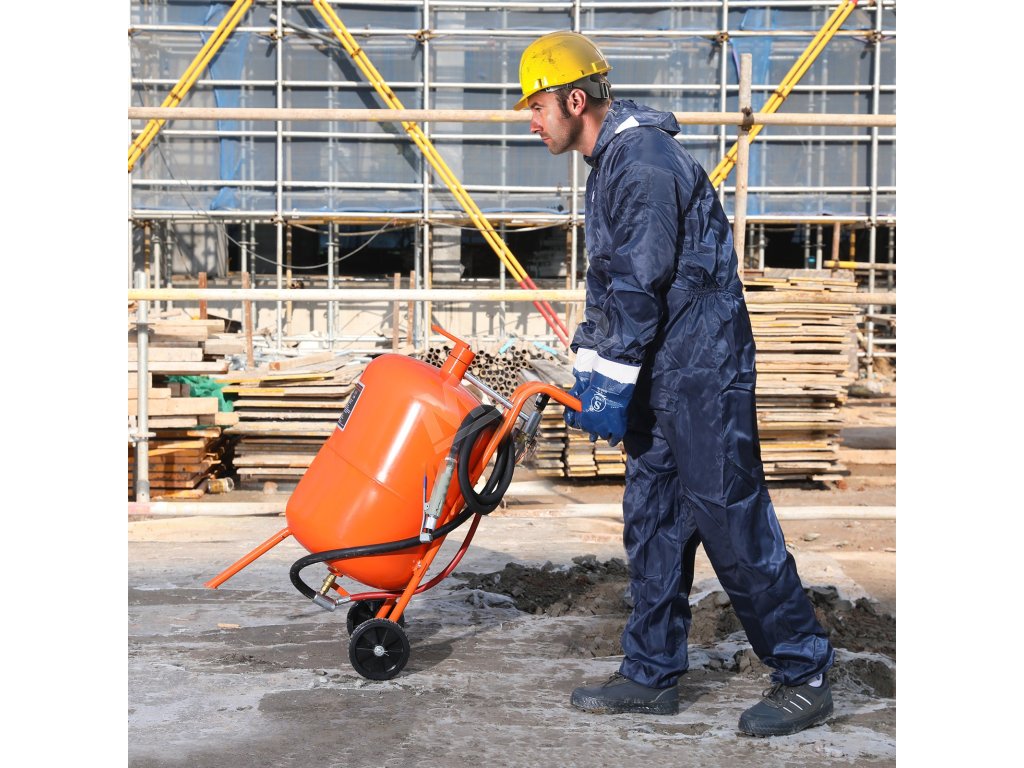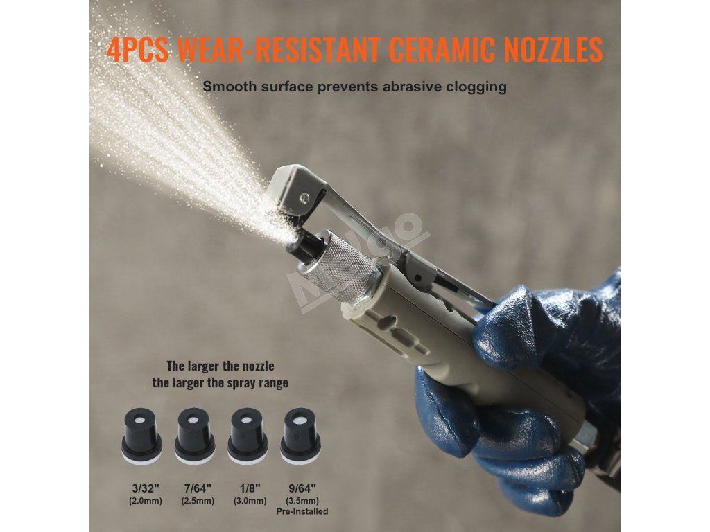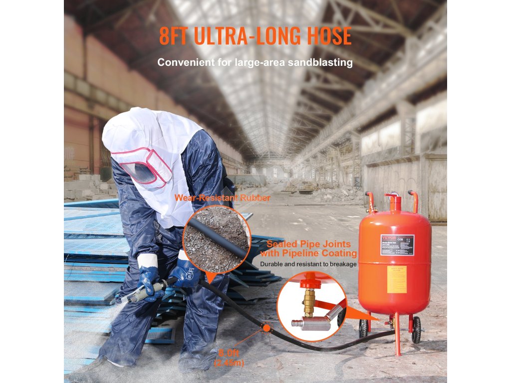Gumené kolieska a pogumovaná rukoväť uľahčujú pohyb, sú vhodné najmä na nepretržitú prácu na veľkej ploche. Vďaka 8ft gumovej hadici sa ľahko dostane do ťažko prístupných oblastí. Spodná opierka poskytuje vysokú stabilitu, čo umožňuje ľahko dokončiť úlohy pieskovania.