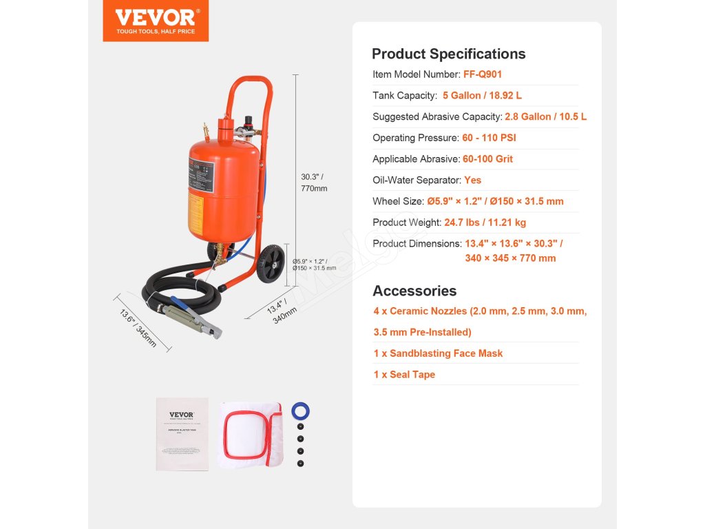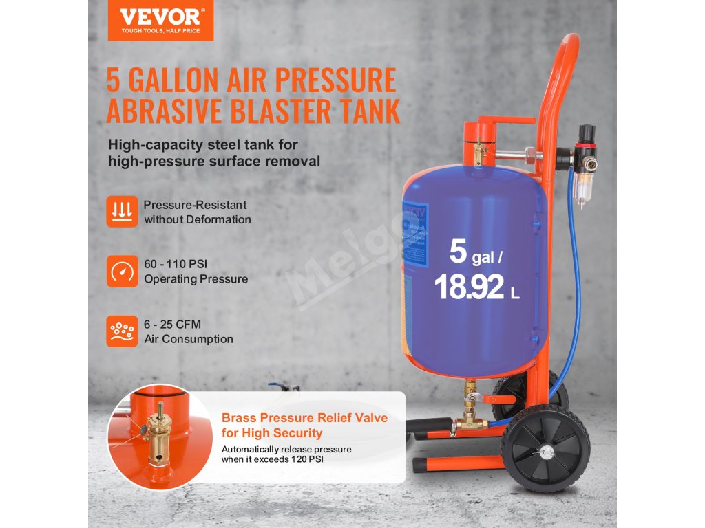 Vyberte si 5-galónový pieskovač VEVOR a zažite jednoduchšiu, efektívnejšiu a presnejšiu úpravu povrchu. Umožňuje vysokotlakovú úpravu povrchu, bez námahy odstraňuje hrdzu, farbu, škvrny a leští veľké plochy, pričom vykonáva aj dokonalé pieskovanie zakrivených povrchov a medzier.
