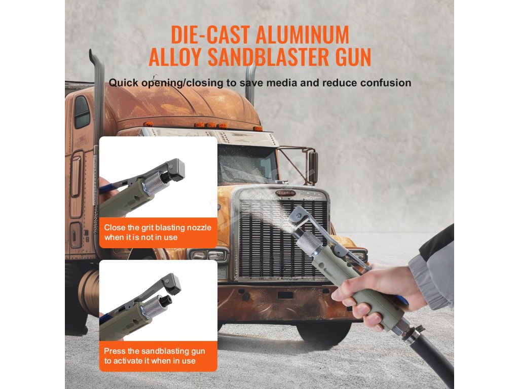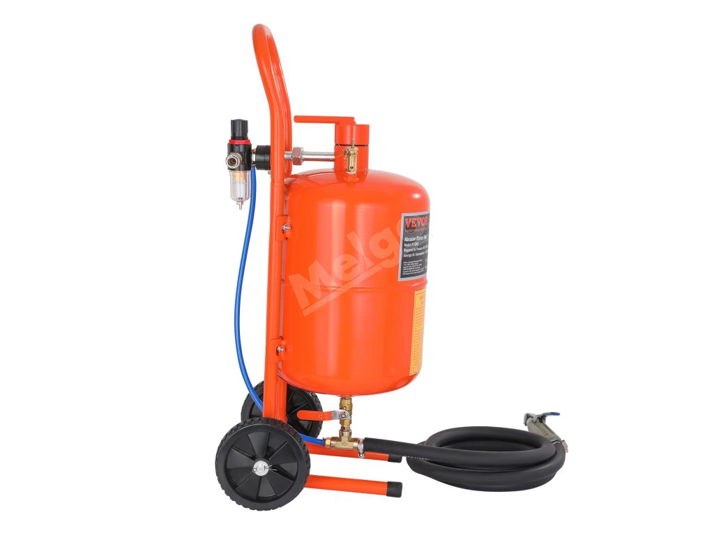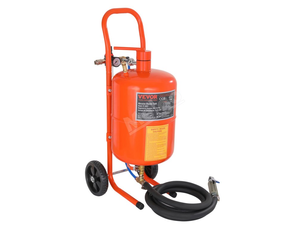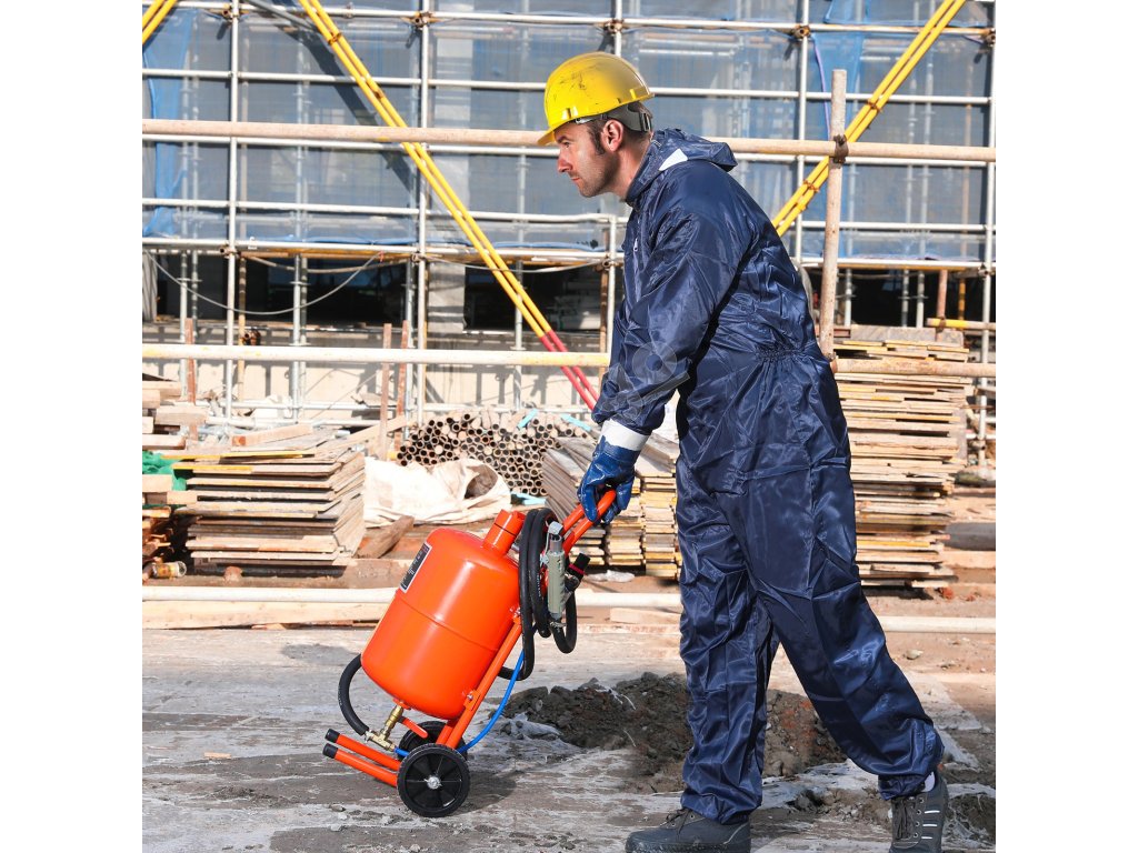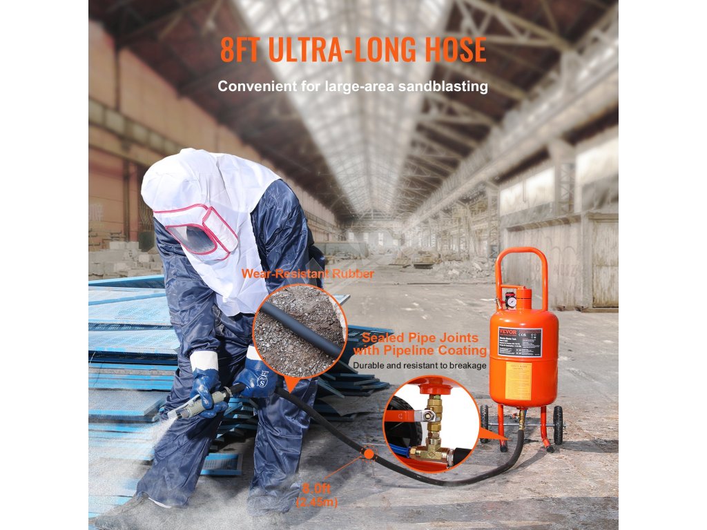 Gumové kolieska a široká rukoväť uľahčujú pohyb, sú vhodné najmä na veľkoplošné nepretržité práce. Vďaka 8ft gumovej hadici sa ľahko dostane do ťažko prístupných oblastí. Spodná opierka zabezpečuje vysokú stabilitu, čo umožňuje ľahko dokončiť pieskovacie úlohy.