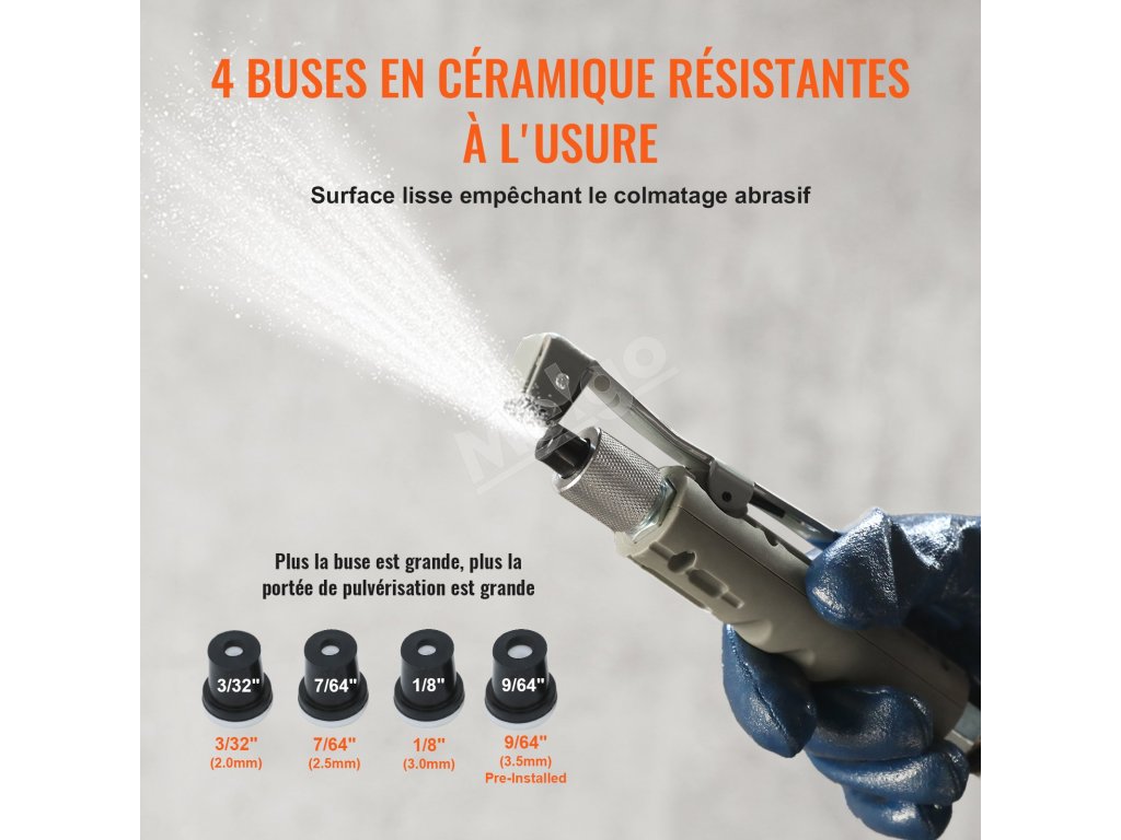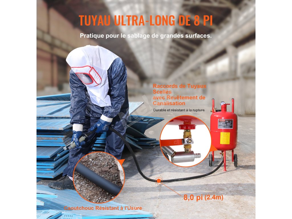 Gumené kolieska a pogumovaná rukoväť uľahčujú pohyb, sú vhodné najmä na veľkoplošné nepretržité práce. Vďaka 8ft gumovej hadici sa ľahko dostane do ťažko prístupných oblastí. Spodná opierka poskytuje vysokú stabilitu, čo umožňuje ľahko dokončiť úlohy pieskovania.