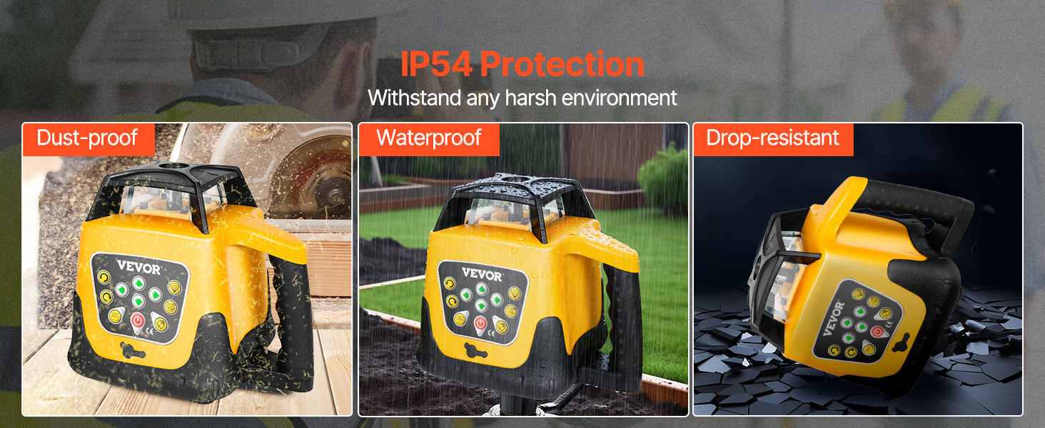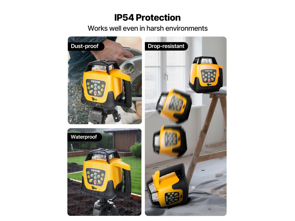 Táto samonivelačná laserová vodováha, vyrobená z priemyselného plastu a vysokokvalitného kovu, je prachotesná a vodotesná, s krytím IP54 pre dlhodobú životnosť.