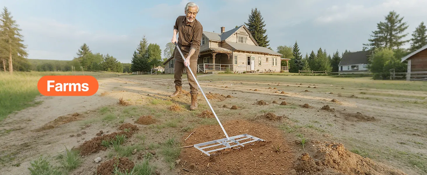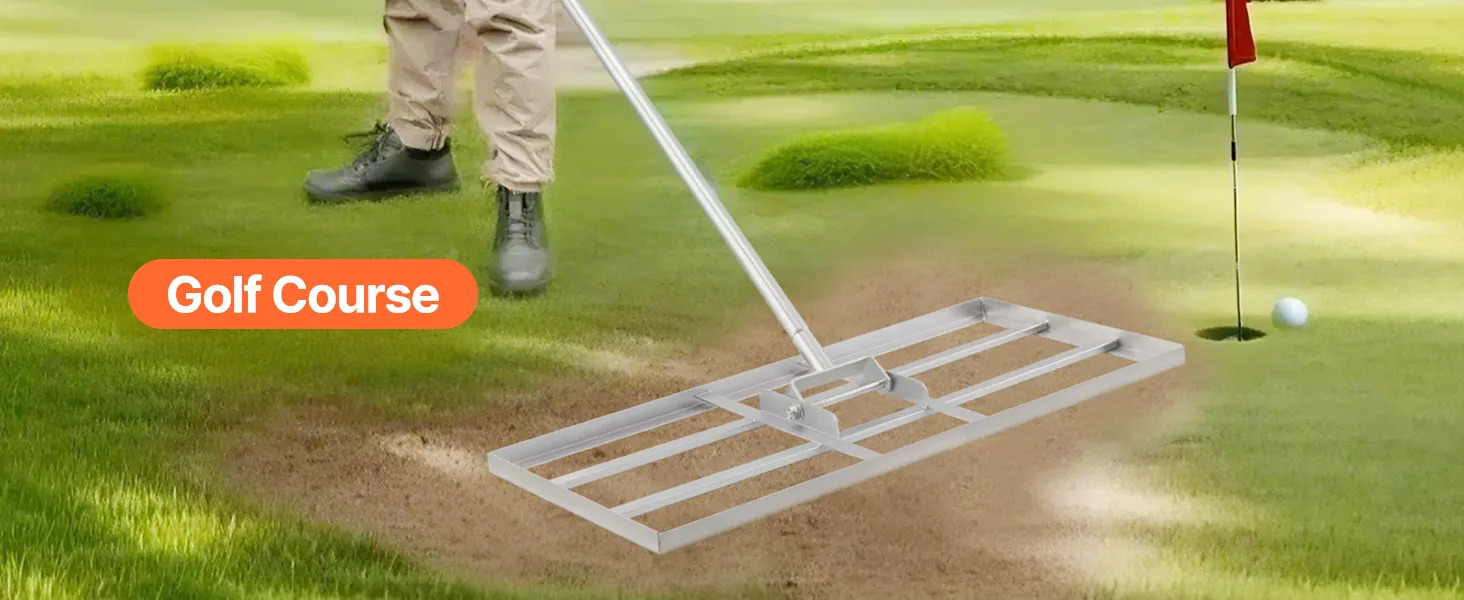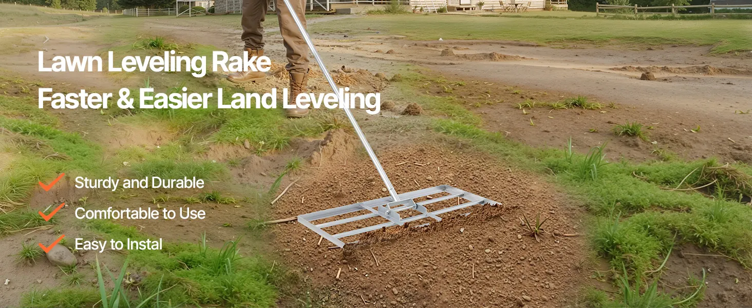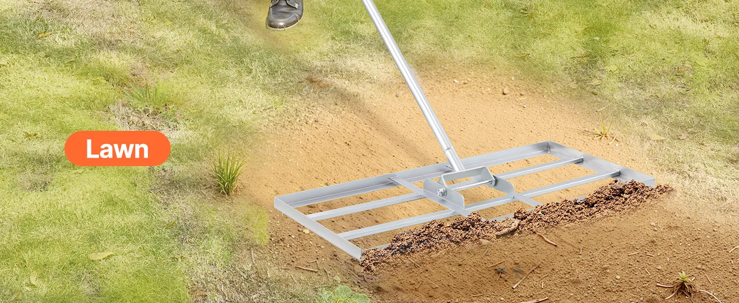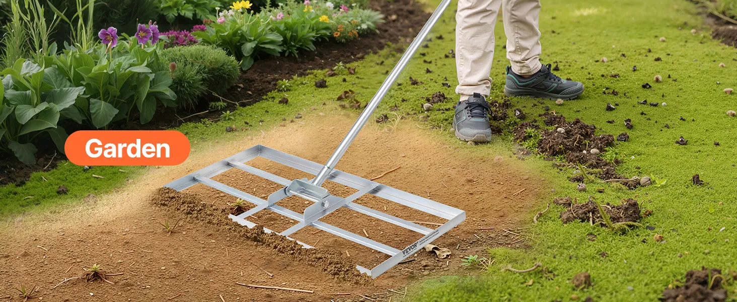 Naše ťažkotonážne hrabličky na vyrovnávanie trávnika so širokou zemnou doskou účinne vyrovnávajú pôdu. Tvrdá uhlíková oceľ s povrchom odolným proti korózii a pevným zváraním na dlhý čas vonku. Rukoväť otočná o 180° s gumovou objímkou na pohodlné uchopenie. Ideálne na farmy, záhrady, golfové ihriská.