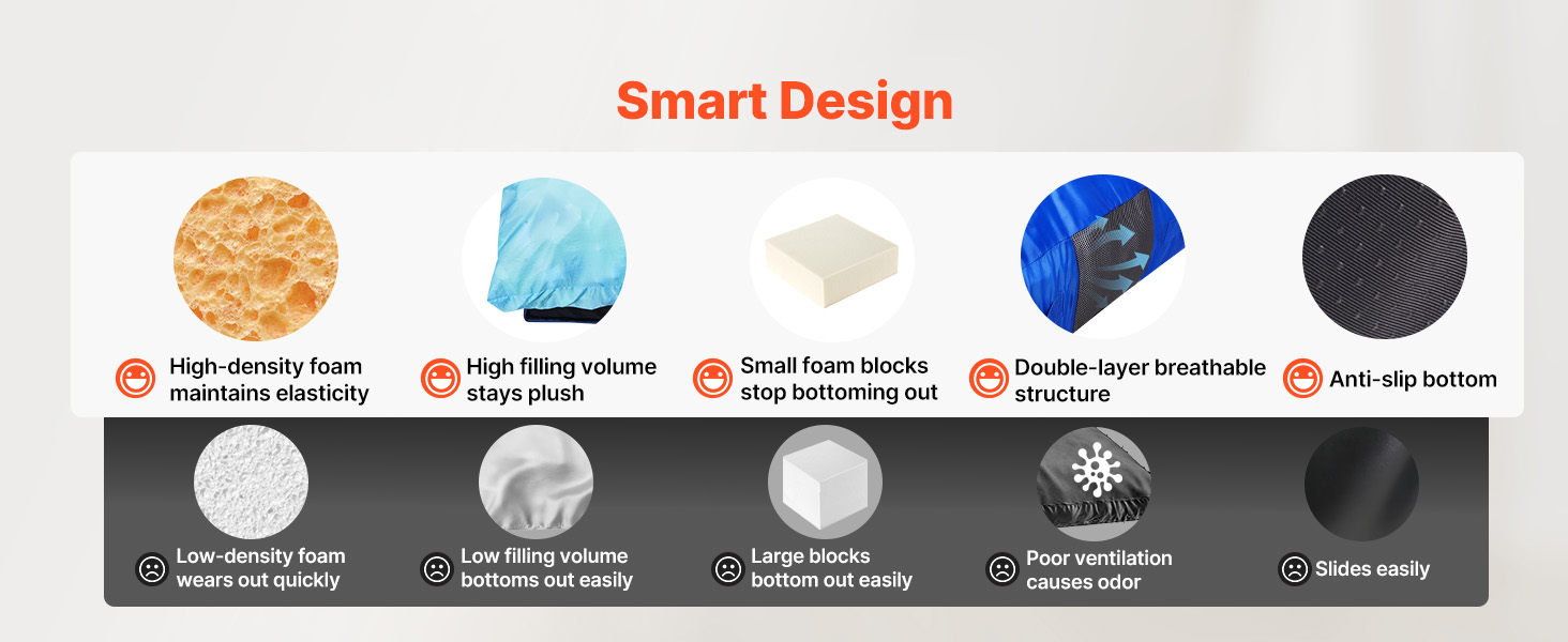 Podložka pre deti má odolný a trvanlivý poťah z materiálu 300D Oxford, zatiaľ čo vodotesná nylonová podšívka zabraňuje rozliatiu tekutín, šťavy alebo nehodám domácich zvierat. Priedušné bočné strany zo sieťoviny zlepšujú prúdenie vzduchu, čím znižujú teplo a zápach, a textúrované protiskluzové dno ju udržuje bezpečne na dreve, dlaždiciach alebo koberci.