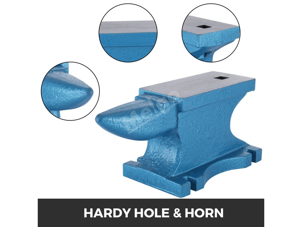 Zaoblený roh liatinovej kovadliny sa uplatňuje pri hladkom ohýbaní a tvarovaní. Štvorcový otvor možno použiť na príslušenstvo, dierovanie a ohýbanie.