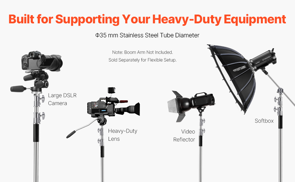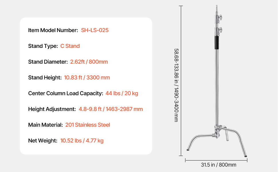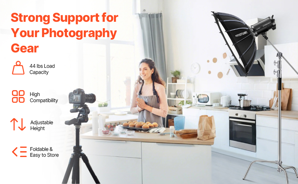 Tento skladací stojan C je vybavený štandardným univerzálnym adaptérom a nosnosťou 44 libier (20 kg), takže bez obáv podporuje video reflektory, softboxy a ďalšie zariadenia. Ľahko nastavte výšku v rozmedzí 4,8 ft až 9,8 ft (1463-2987 mm), aby ste dosiahli ideálny uhol snímania pre akýkoľvek projekt.