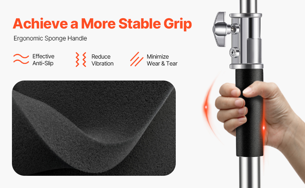 Tento stojan na fotografické svietidlá s ergonomickou hubovitou rukoväťou poskytuje bezpečné a pohodlné uchopenie, čím zlepšuje stabilitu počas používania. Protišmyková konštrukcia pomáha znižovať vibrácie a opotrebovanie, čím zabezpečuje bezproblémové používanie aj počas dlhého fotografovania.