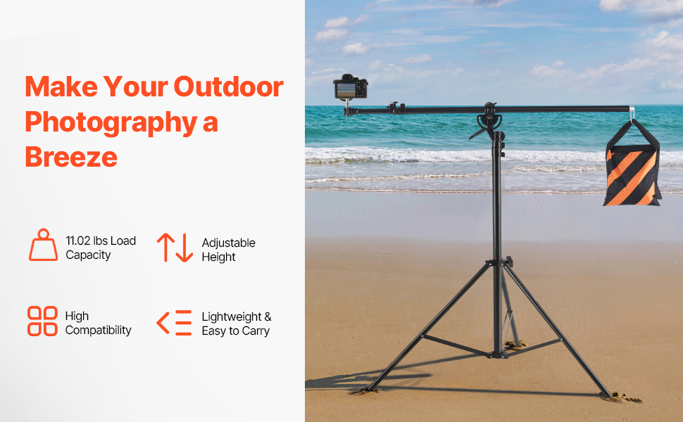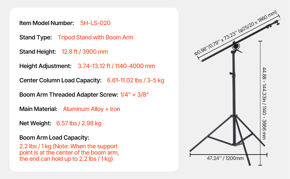 Tento svetelný stojan je vybavený univerzálnym adaptérom so závitom 1/4" a 3/8", ktorý podporuje väčšinu fotografického vybavenia. Vďaka nosnosti stredového stĺpika 6,61 - 11,02 libier, nosnosti ramena výložníka 2,2 libier, nastaviteľnej výške 3,74 - 13,12 stôp a ramenu výložníka nastaviteľnému v uhle 180° vás pokryje.