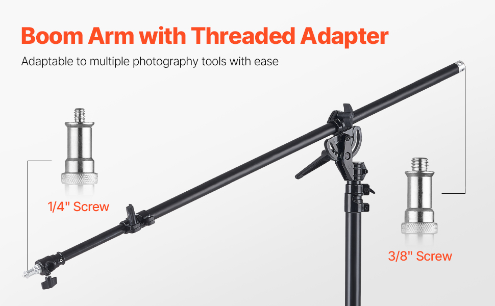 Tento svetelný stojan s ramenom výložníka má univerzálnu konštrukciu adaptéra so závitom, ktorý podporuje skrutku 1/4" aj 3/8". Ľahko sa integruje so širokou škálou fotografického vybavenia a ponúka pohodlnú a praktickú kompatibilitu pre všetky vaše potreby pri fotografovaní.