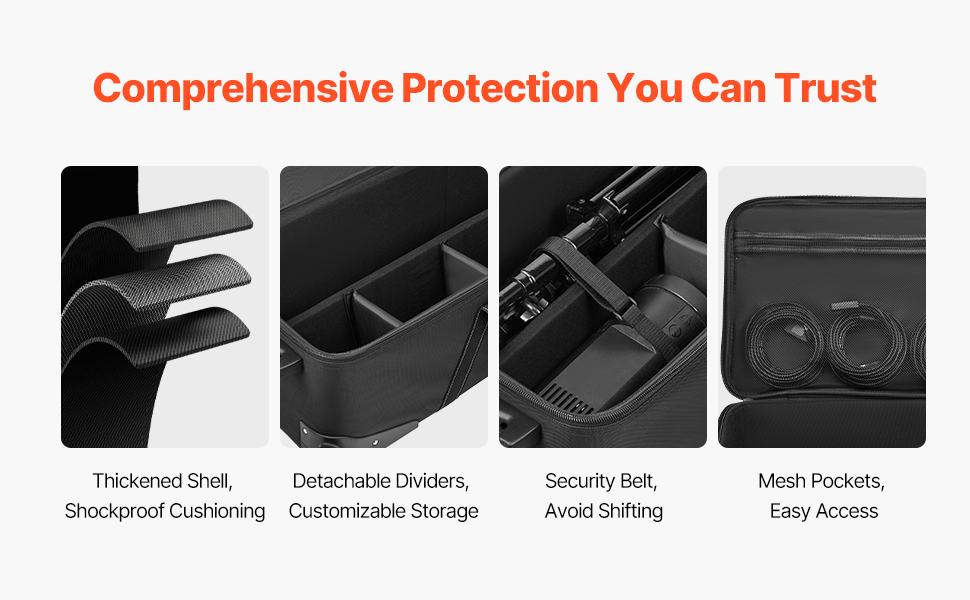 Zhrubnutý vonkajší povrch poskytuje nárazuvzdornú odolnosť, zatiaľ čo bezpečné popruhy zabraňujú akémukoľvek posunu počas prepravy. Flexibilné polstrované prepážky prinášajú prispôsobiteľnú organizáciu a sieťované vrecká uľahčujú rýchly prehľad a prístup k vášmu vybaveniu.