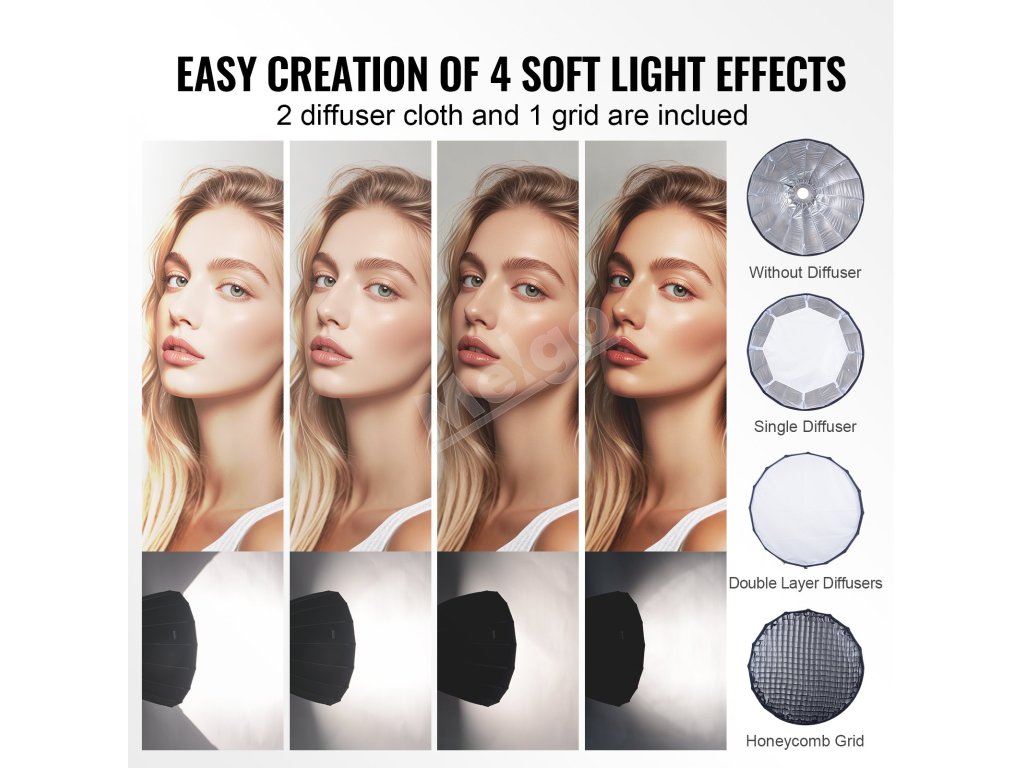 Tento softbox je vybavený 3 difúzormi pre 4 režimy osvetlenia na podporu rôznych kombinácií. Vrátane difúzora bez difúzora, jednoduchého difúzora, dvojvrstvového difúzora a voštinovej mriežky, ktoré poskytujú flexibilné svetelné efekty.