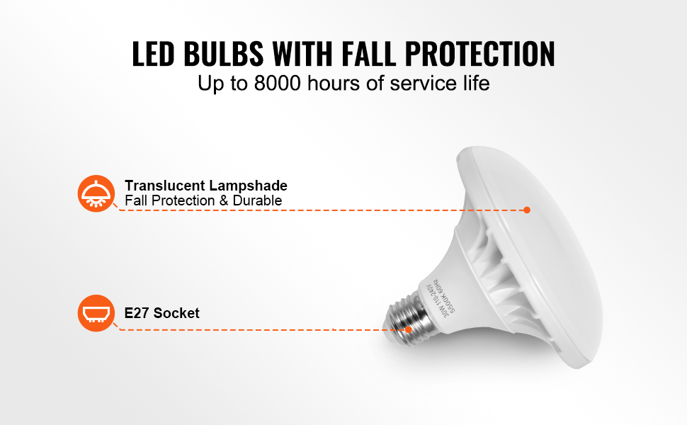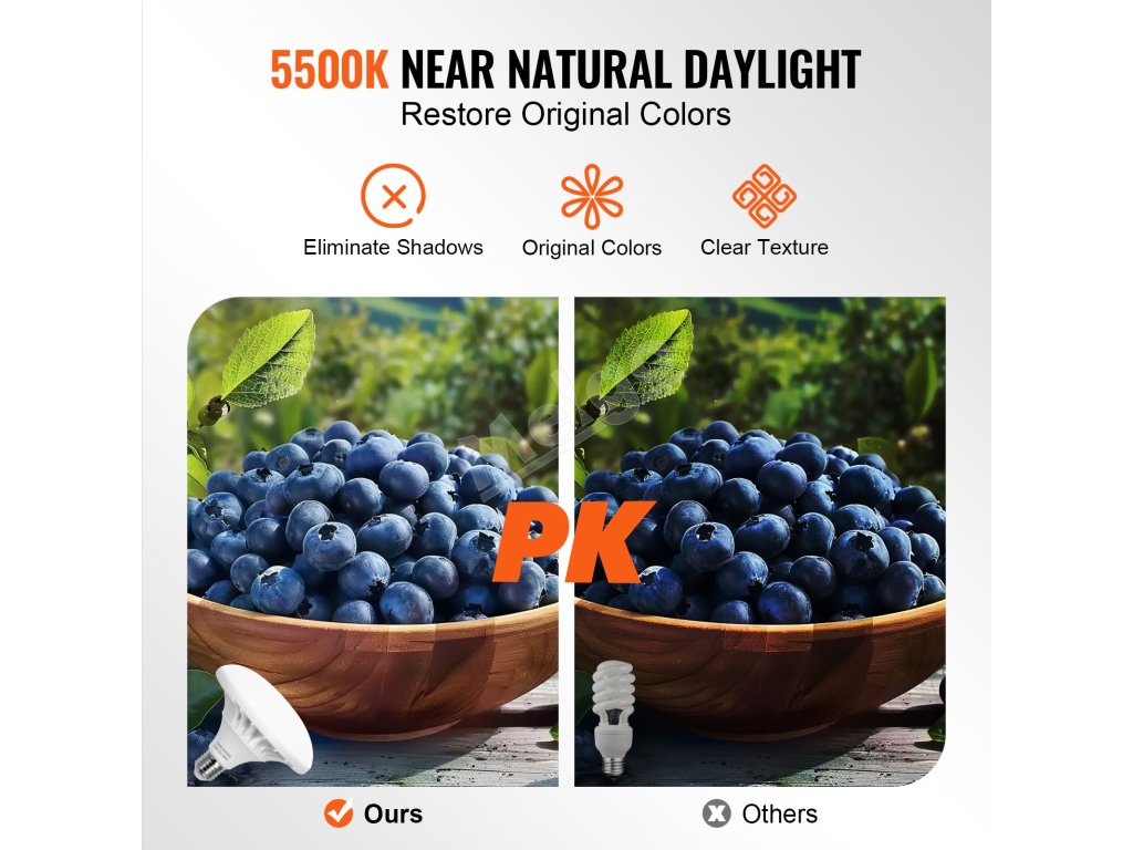 Táto žiarovka poskytuje 1 svetelný efekt: biely, 5500K blízky prirodzenému dennému svetlu na obnovenie pôvodných farieb. Životnosť žiarovky je až 8 000 h. Priesvitné tienidlo je odolné a má ochranu proti pádu. Hodí sa na rôzne potreby osvetlenia, ako sú reklamné produkty, fotografovanie atď.