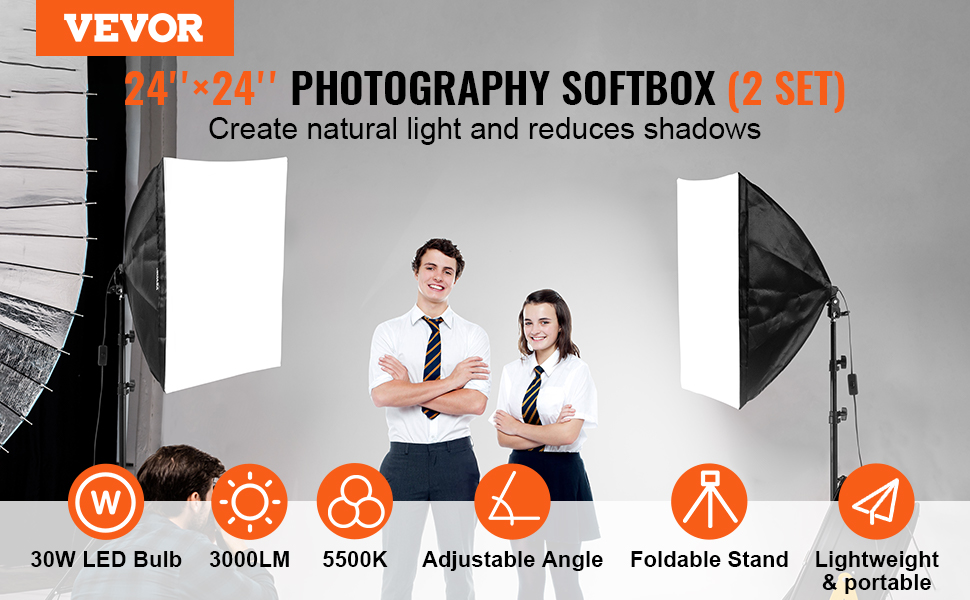 Naša súprava na osvetlenie fotografického softboxu 24" x 24" s 30W LED svetlom, jas 3000LM. Podporuje nastavenie uhla, je vhodný pre všetky druhy potrieb fotografovania. Skladacia konštrukcia stojana sa ľahko prenáša a skladuje, je ideálna na profesionálnu fotografiu a produkciu videa.