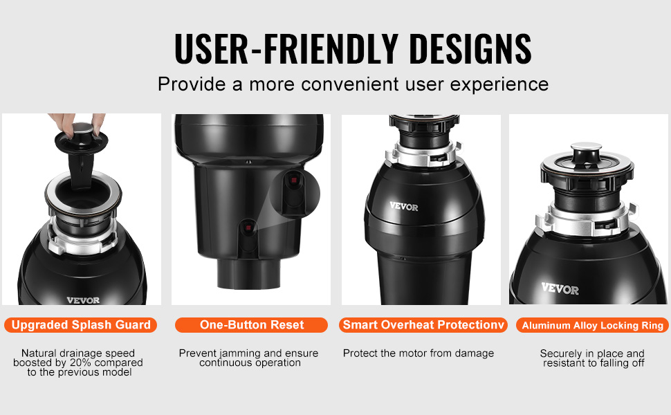 Zažite zvýšené pohodlie vďaka premysleným funkciám. Tlačidlo manuálneho resetovania zabraňuje zaseknutiu; inteligentná ochrana proti prehriatiu chráni motor pred poškodením; vylepšená ochrana proti rozstreku účinne znižuje rozstrekovanie, čím udržiava vašu kuchyňu čistú a zároveň účinne spracováva potravinový odpad.