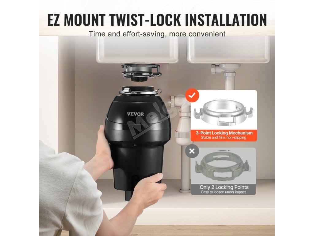 Vďaka systému inštalácie EZ mount twist-and-lock sa tento drvič potravinového odpadu do kuchynského drezu ľahko inštaluje. Potrebné montážne príslušenstvo je súčasťou balenia - nie sú potrebné žiadne ďalšie zložité nástroje ani pomoc. Začnite pracovať rýchlo a bez námahy.