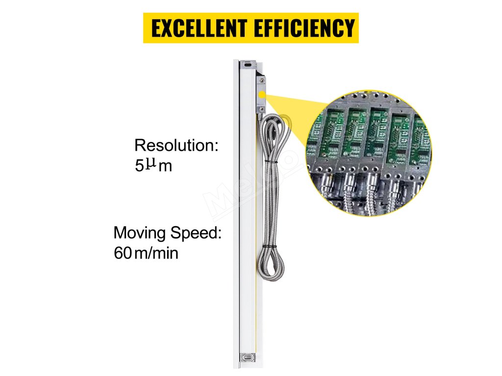 Lineárne meradlo používa inteligentný čip s rýchlosťou pohybu 60 m/min a rozlíšením 5 μm pre vyšší pracovný výkon. Konektor: 9-pinový konektor (Pin-26789), 2 na 0V, 6 na A, 7 na 5V, 8 na B, 9 na R1.