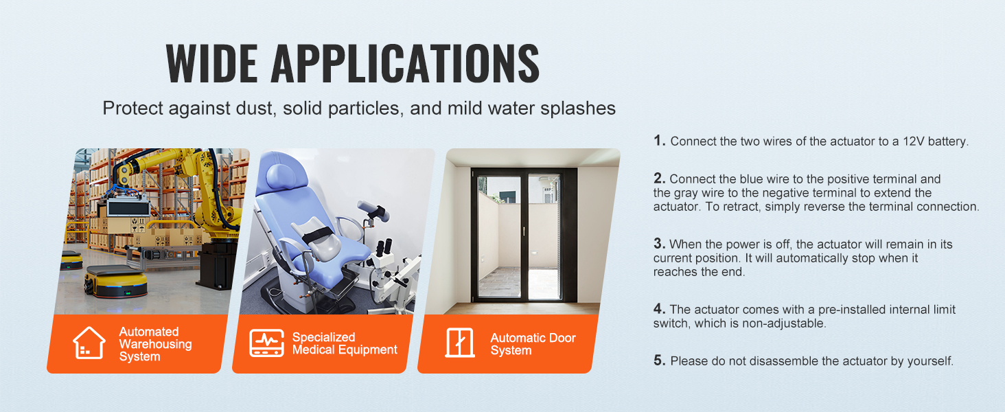 Vďaka stupňu krytia IP44 poskytuje náš lineárny aktuátor spoľahlivý ochranný výkon a zachováva stabilitu pri pôsobení prachu, pevných častíc a mierne striekajúcej vody (Upozornenie: Voda by nemala vniknúť do vnútra motora, pretože môže spôsobiť jeho vyhorenie)