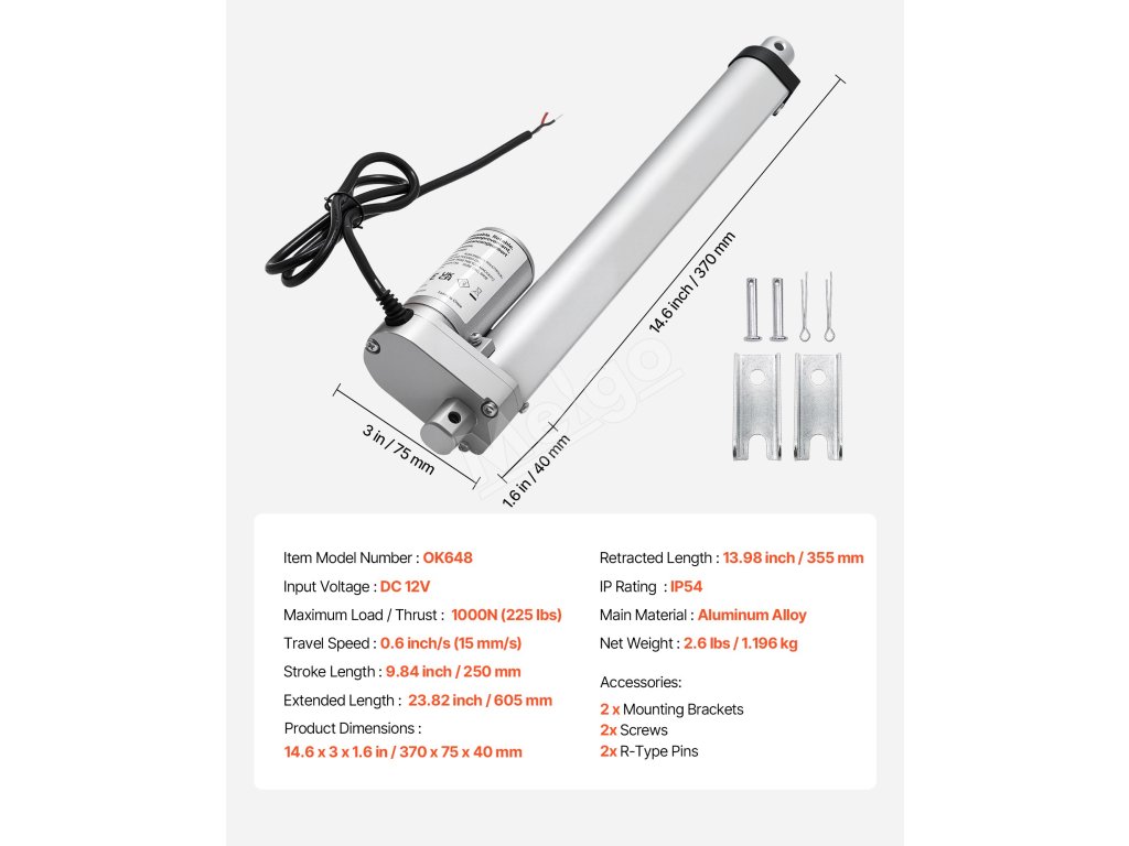 Lineárny aktuátor 12 V, 250 mm zdvih, 15 mm/s, 1000 N, IP54, držiak