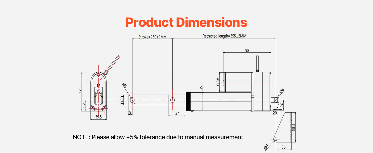 Jasne zobrazené rozmery výrobku pre vašu orientáciu, ktoré zabezpečujú optimálny výber a montáž. Dĺžka zdvihu: 9,84" (250 mm); vysunutá dĺžka: 23,82" (605 mm); zasunutá dĺžka: 13,98" (355 mm).