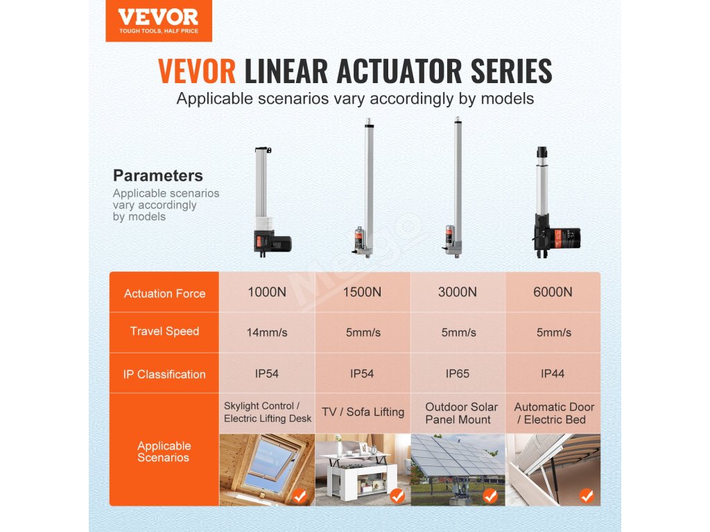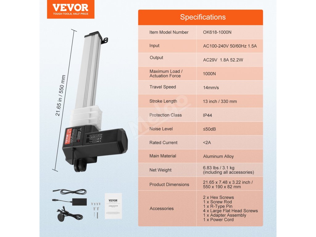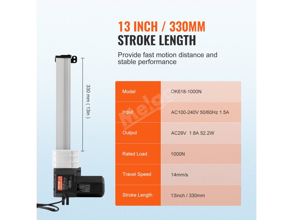 Zažite vysokorýchlostný pohyb 0,55"/s a 220 libier silnej aktivačnej sily so súpravou VEVOR 24V lineárneho aktuátora ! Poháňaný robustným motorom a ponúkajúci presné otáčanie poskytuje vysokoúčinný pohyb pre nastavovanie nábytku, automatizačné systémy, mechanické zariadenia a ďalšie.