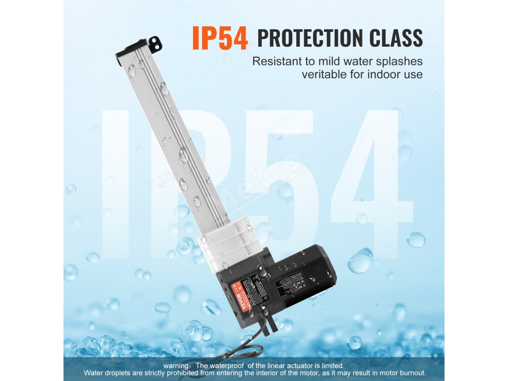 Vďaka stupňu krytia IP44 poskytuje náš lineárny pohybový aktuátor spoľahlivý ochranný výkon, pričom si zachováva stabilitu pri pôsobení prachu, pevných častíc a ľahkej striekajúcej vody (Upozornenie: Voda by nemala vniknúť do vnútra motora, pretože môže spôsobiť jeho vyhorenie)