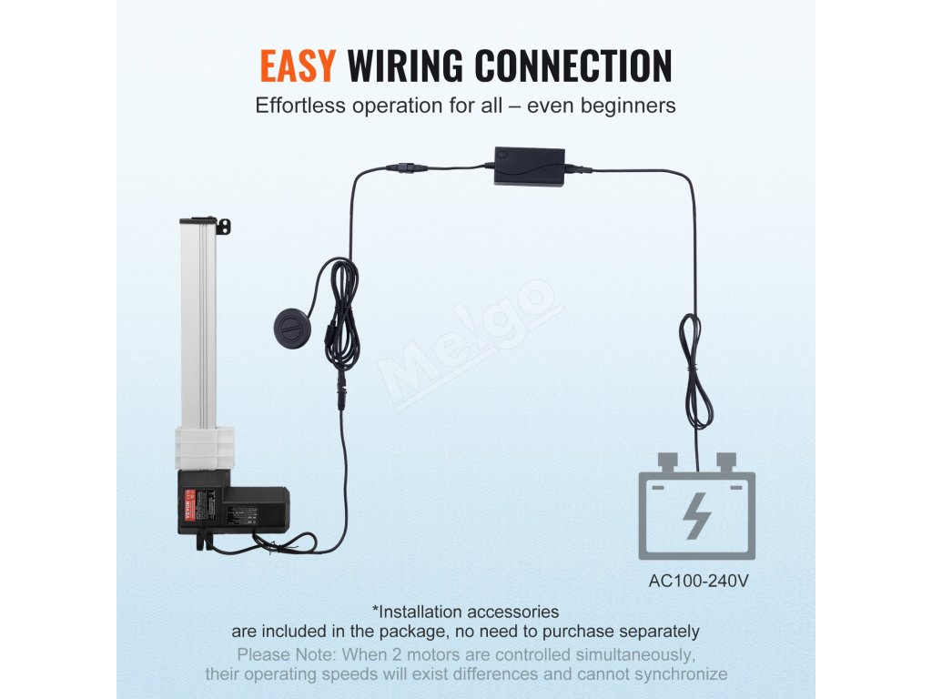 Súprava aktuátora obsahuje potrebné komponenty na jednoduchú montáž vrátane napájacieho adaptéra, napájacieho kábla a súpravy montážneho príslušenstva. Vďaka týmto komponentom môžete lineárne aktuátory rýchlo a jednoducho nainštalovať na svoje elektrické zariadenia.