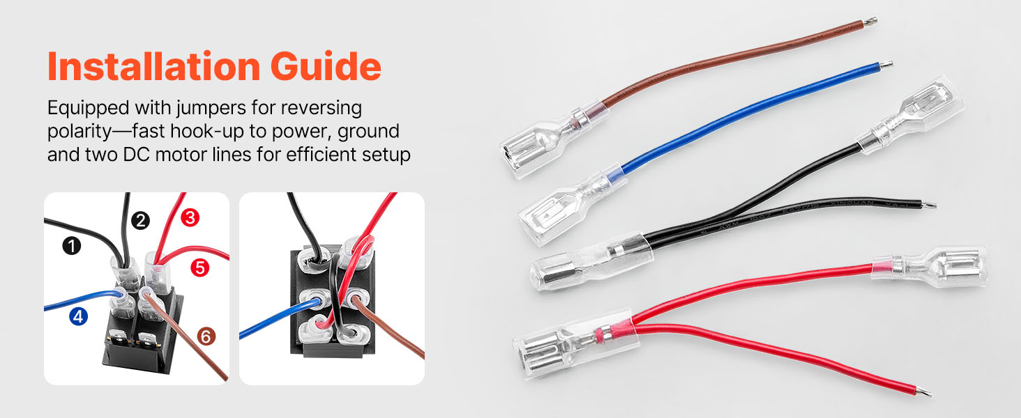 Zabudované prepojky na zmenu polarity umožňujú rýchle pripojenie k napájaniu, uzemneniu a dvom vedeniam jednosmerného motora pre plynulejšie ovládanie.