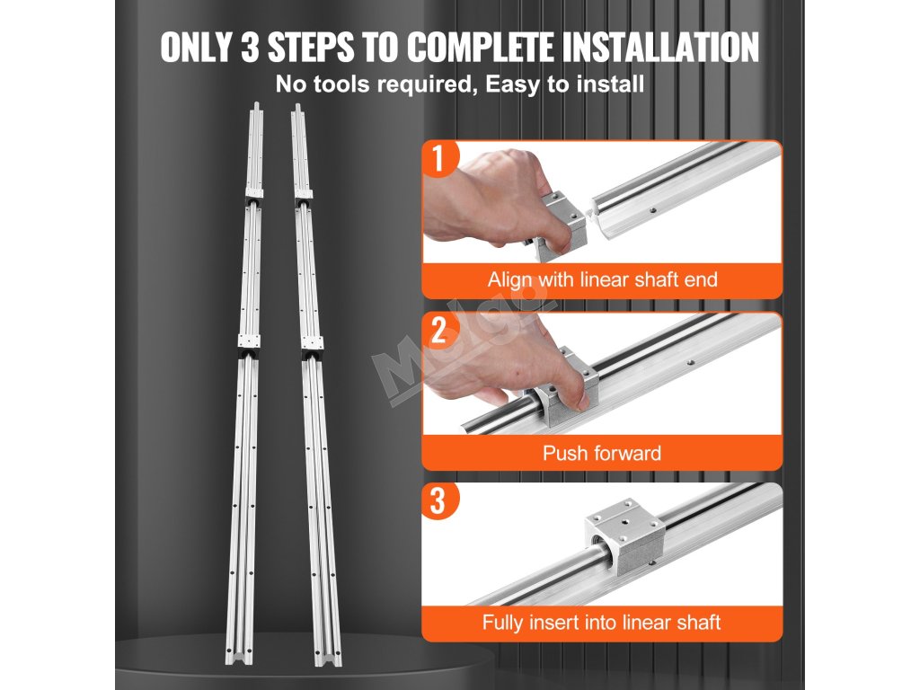 Vysokokvalitná lineárna vodiaca lišta VEVOR SBR obsahuje 2 vodiace lišty a 4 posuvné bloky. Odolné hliníkové vodiace koľajnice majú presný priemer a vzdialenosť otvorov, zatiaľ čo posuvné bloky SBR využívajú guľôčkové ložiská na hladký a nerušený pohyb.