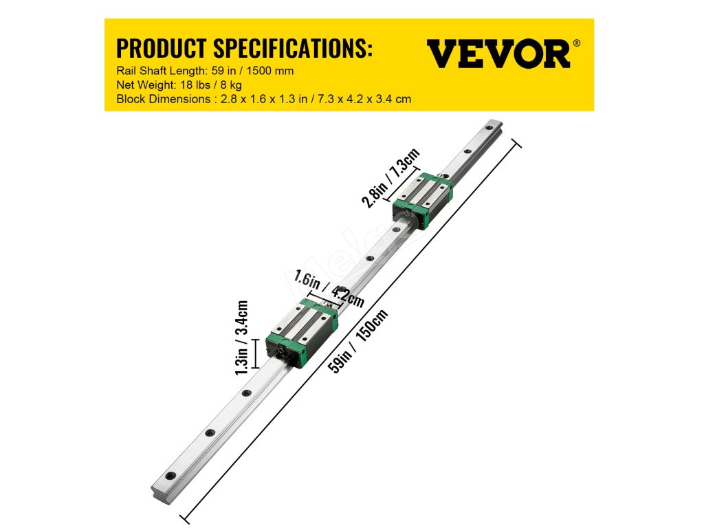 Súprava lineárneho vedenia obsahuje 2 kusy 1500 mm / 59" dlhých hriadeľov koľajníc HGR20, 4 bloky a súpravu guľôčkových skrutiek.