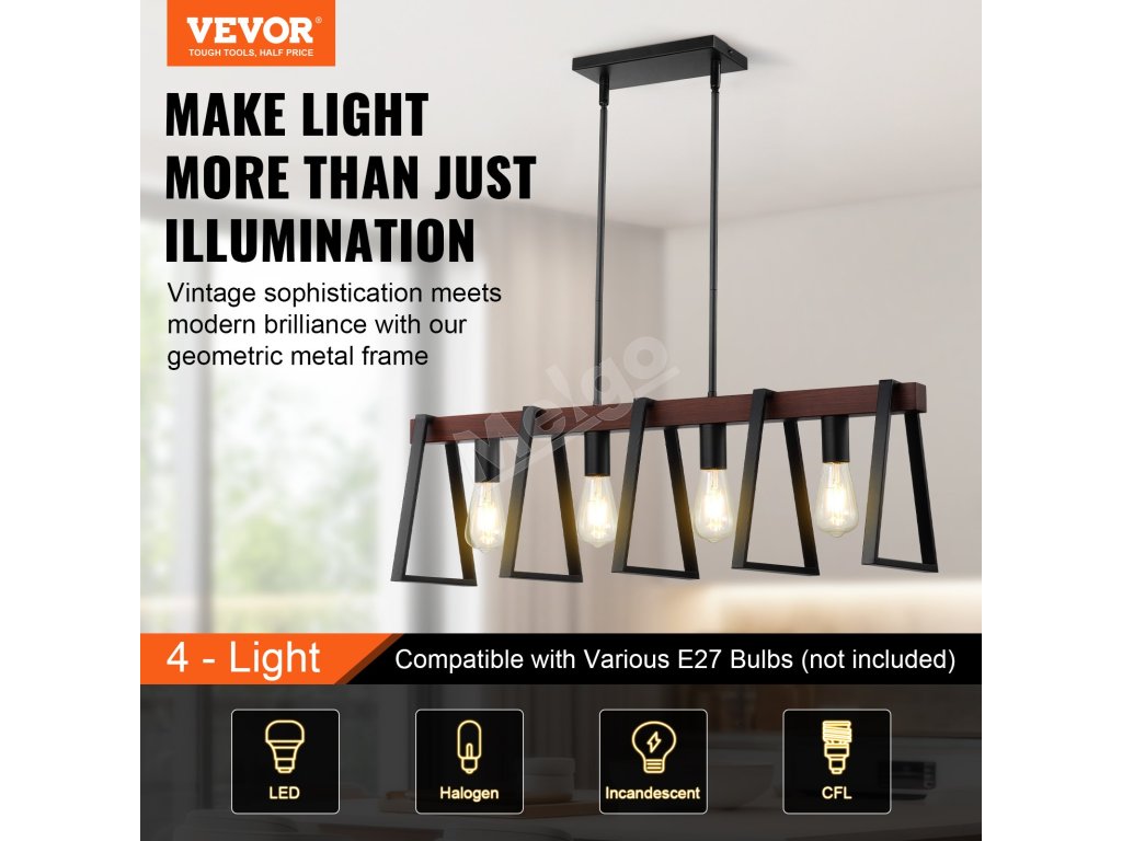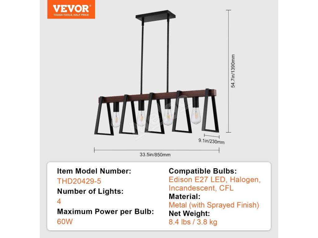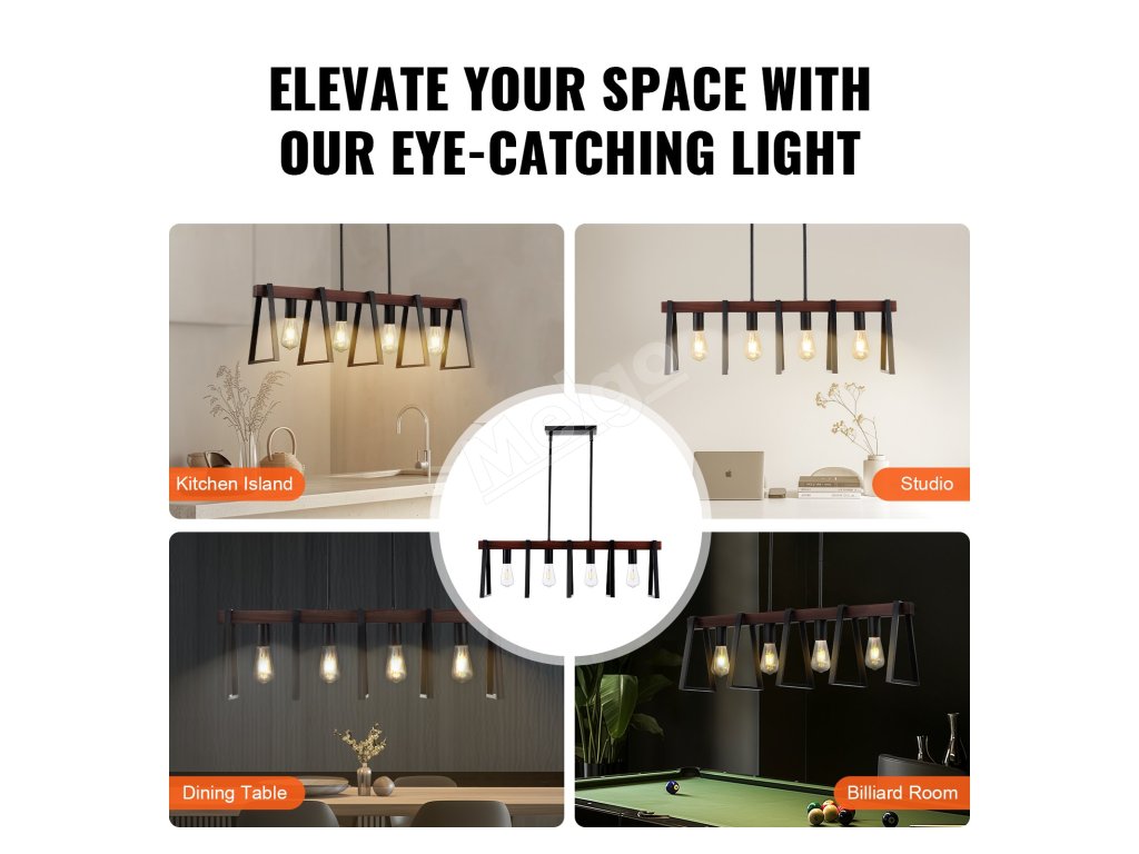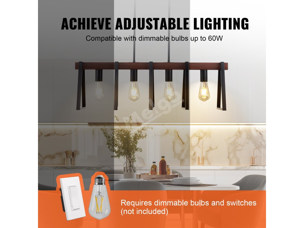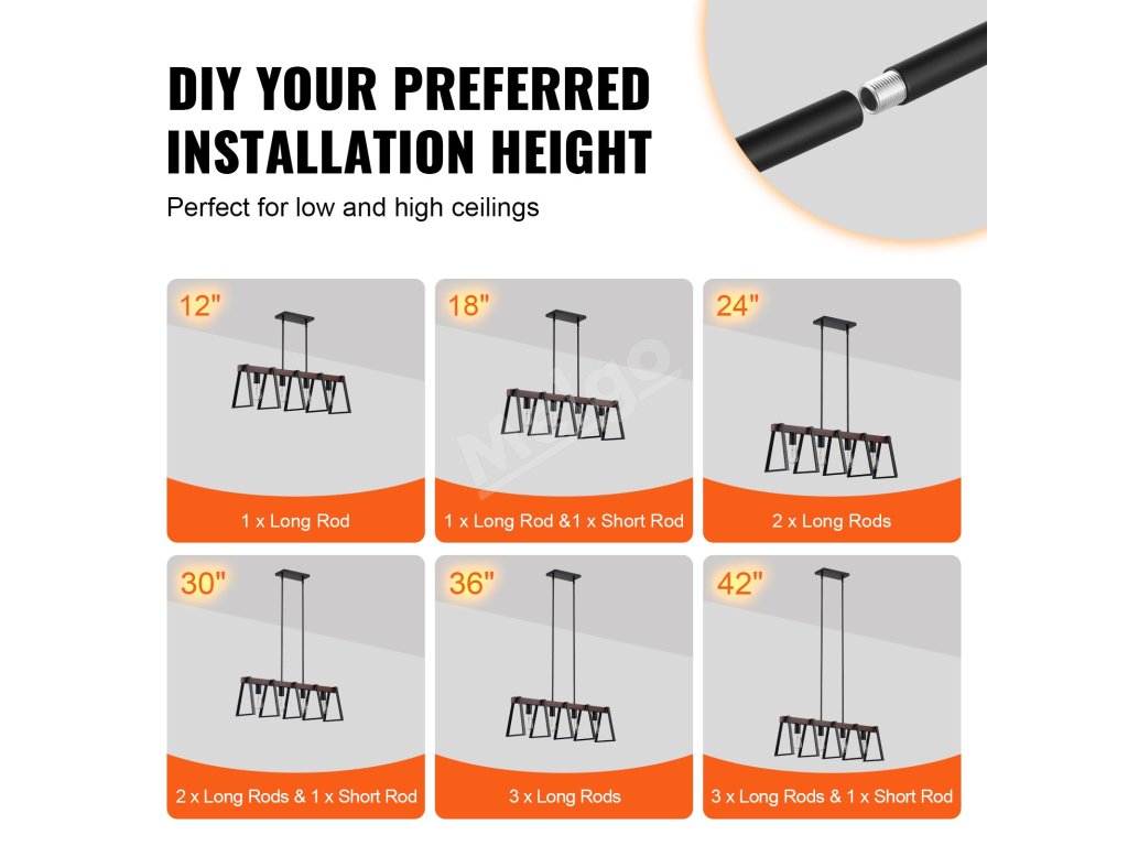 Naše svietidlo do jedálne sa dodáva s 8 tyčami (2 x 6-palcové a 6 x 12-palcové), vďaka čomu môžete výšku svietidla ľahko prispôsobiť akémukoľvek stropu. Každá svetelná hlava podporuje až 60 W a všetky typy žiaroviek E27 (LED, halogénové, žiarovky a CFL).