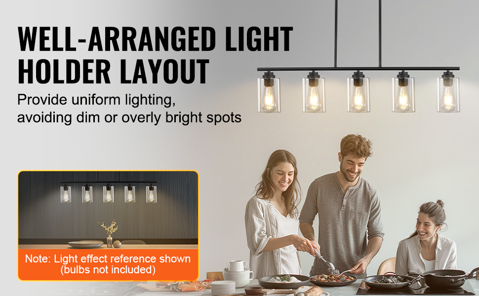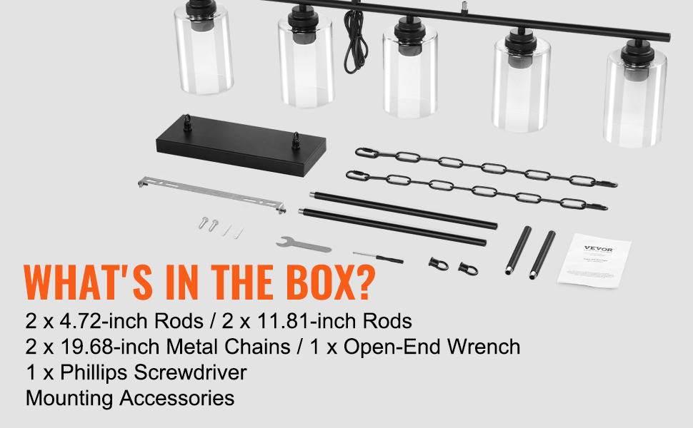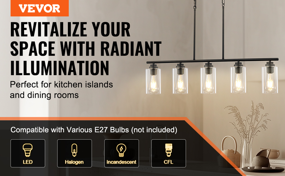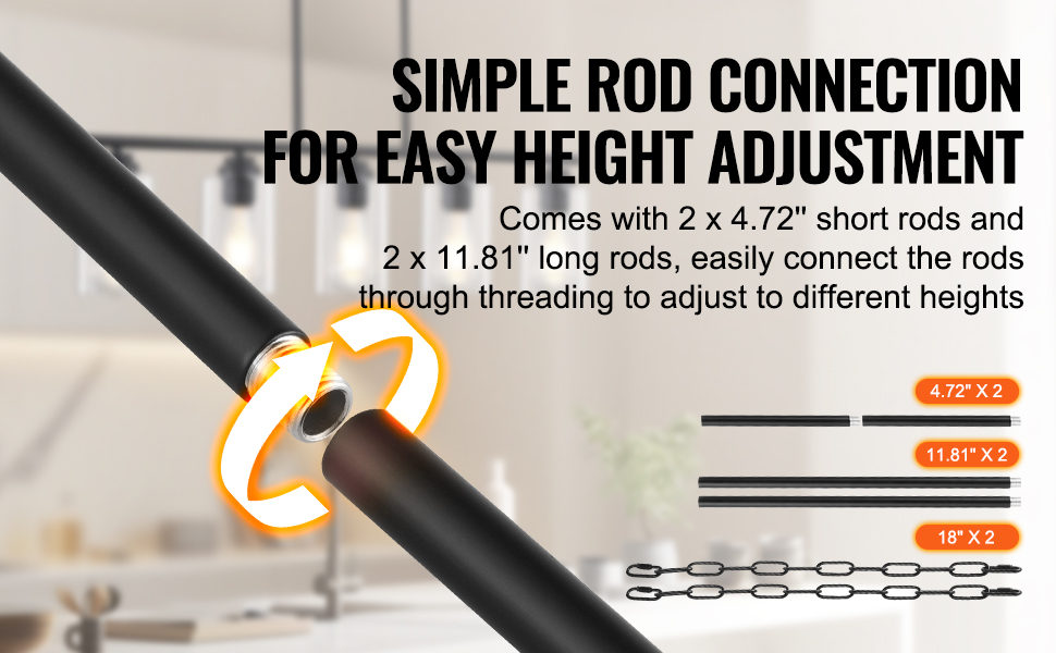 Naše svietidlo do jedálne sa dodáva so 4 tyčami (2 x 4,72-palcové a 2 x 11,81-palcové), vďaka čomu môžete výšku svietidla ľahko prispôsobiť akémukoľvek stropu. Každá svetelná hlava podporuje až 60 W a všetky typy žiaroviek E27 (LED, halogénové, žiarovky a CFL).