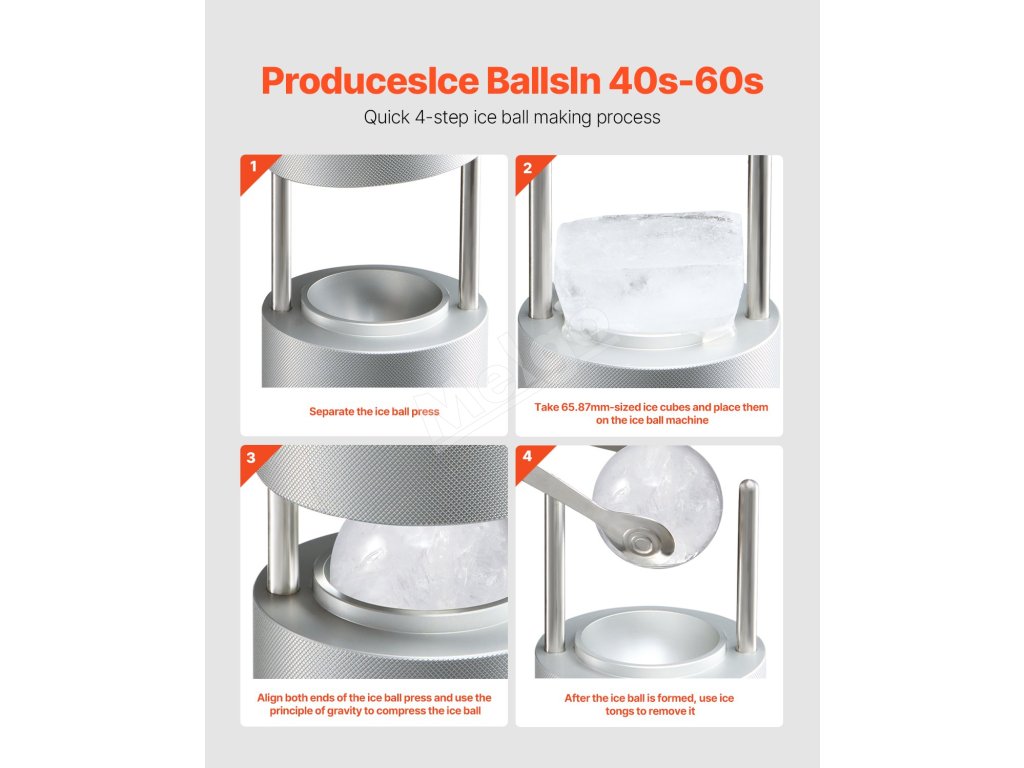 Lis na ľadové gule využíva gravitáciu a prirodzenú tepelnú vodivosť kovu na lisovanie kociek ľadu a ich rezanie na správnu veľkosť. Výroba jednej ľadovej gule trvá 40 - 60 sekúnd, a ak ju chcete opätovne použiť, pred ďalším použitím ju namočte do teplej vody.
