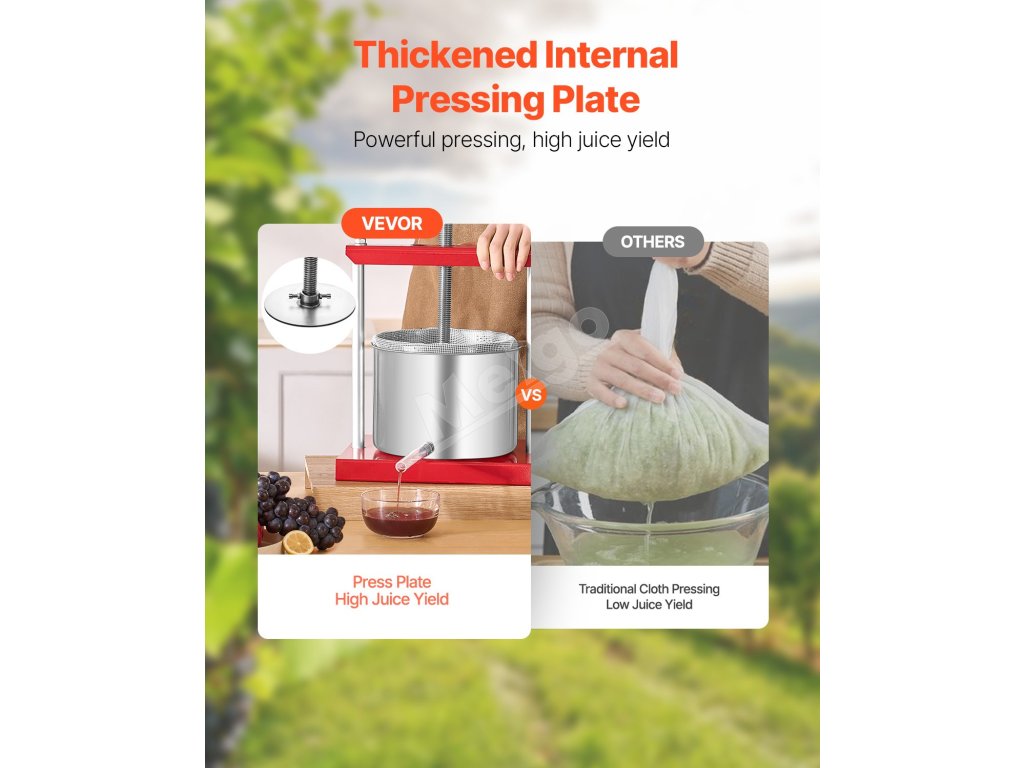 Zahustená lisovacia doska z nehrdzavejúcej ocele zabezpečuje dôkladnejšie lisovanie, účinnú extrakciu a rýchly výstup šťavy. Veľkokapacitná konštrukcia s objemom 6 l/1,6 galóna poskytuje stále čerstvú šťavu.